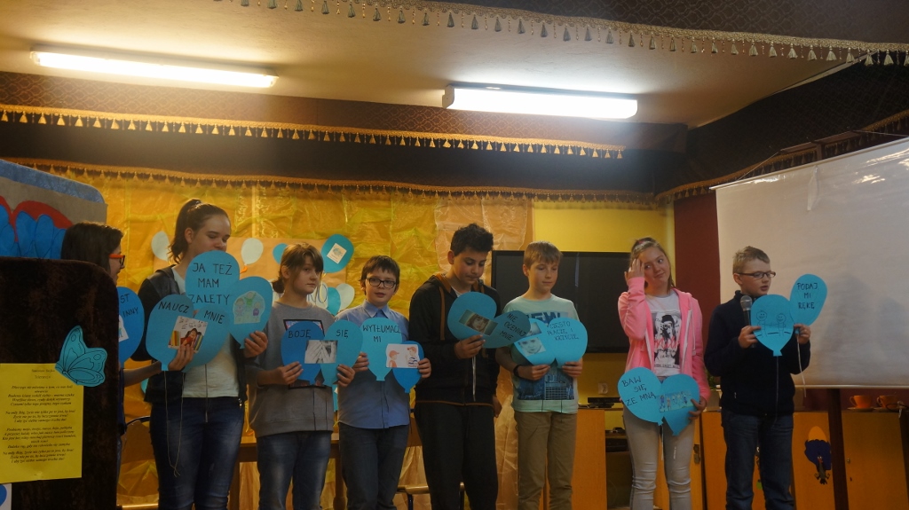 Dzień rozpoczął się przedstawieniem teatralnym „Kosmita”. Następnie odbył się apel, na którym została przybliżona idea Dnia Świadomości na temat Autyzmu. Zwrócono także uwagę na to, czym jest autyzm oraz z jakimi problemami i trudnościami spotykają się osoby autystyczne. Uczniowie klasy VI przedstawili za pomocą scenek, w jaki sposób powinniśmy się zachowywać w stosunku do osób mających autyzm, a także przedstawili prośby dziecka z autyzmem. Następnie wszyscy zaśpiewali piosenkę „Wyciągnij dłoń”. Na zakończenie wypuszczono w niebo niebieskie balony, co stało się już tradycją szkoły.