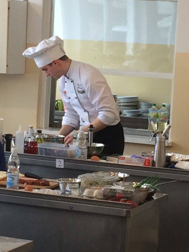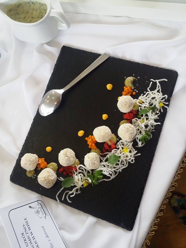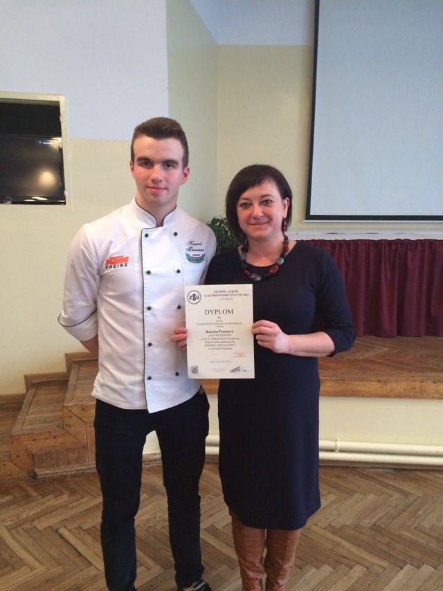 Zadanie było trudne i kosztowne, ale zawodnicy doskonale poradzili sobie z tematem. Zespół Szkół Gastronomiczno-Hotelarskich w Wiśle reprezentował uczeń klasy trzeciej Karol Procner, który przygotował „Rafaello z dorsza”. Potrawa składała się z trzech rodzajów kawioru, soku marchewkowego, wina gronowego, nalewki pigwowej, prażonego makaronu ryżowego, musu z awokado, białej czekolady z chili, kremu na bazie gotowanych żółtek i majonezu oraz pikantnych kuleczek z dorsza obtoczonych w kokosie. Zawodnicy w czasie 120 minut musieli sporządzić dziewięć porcji zakąski oraz wykonać dodatkowe zadanie konkursowe, polegające na przygotowaniu jaja poszetowego z grzanką. W gronie czterdziestu czterech zawodników Karol uzyskał wyróżnienie. Gratulujemy i życzymy kolejnych sukcesów.