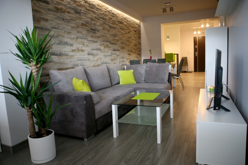 Narożnik wielofunkcyjny rozkładany z możliwością spania, sofa dwuosobowa rozkładana z możliwością spania, dwa komplety pościeli, dwa koce, stolik kawowy, duży rozkładany stół, 6 krzeseł, szafka TV, szafka typu słupek, telewizor SONY smart TV 43’’ z dostępem do internetu, ruter WI-FI.