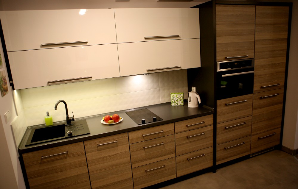 Płyta indukcyjna, lodówka z zamrażalnikiem, piekarnik z funkcją mikrofali, zmywarka, zlewozmywak, czajnik elektryczny, komplet naczyń, talerzy, noże, sztućce, garnki, patelnie, salaterki, szklanki do piwa, kieliszki do alkoholi, otwieracze do piwa, wina, konserw.