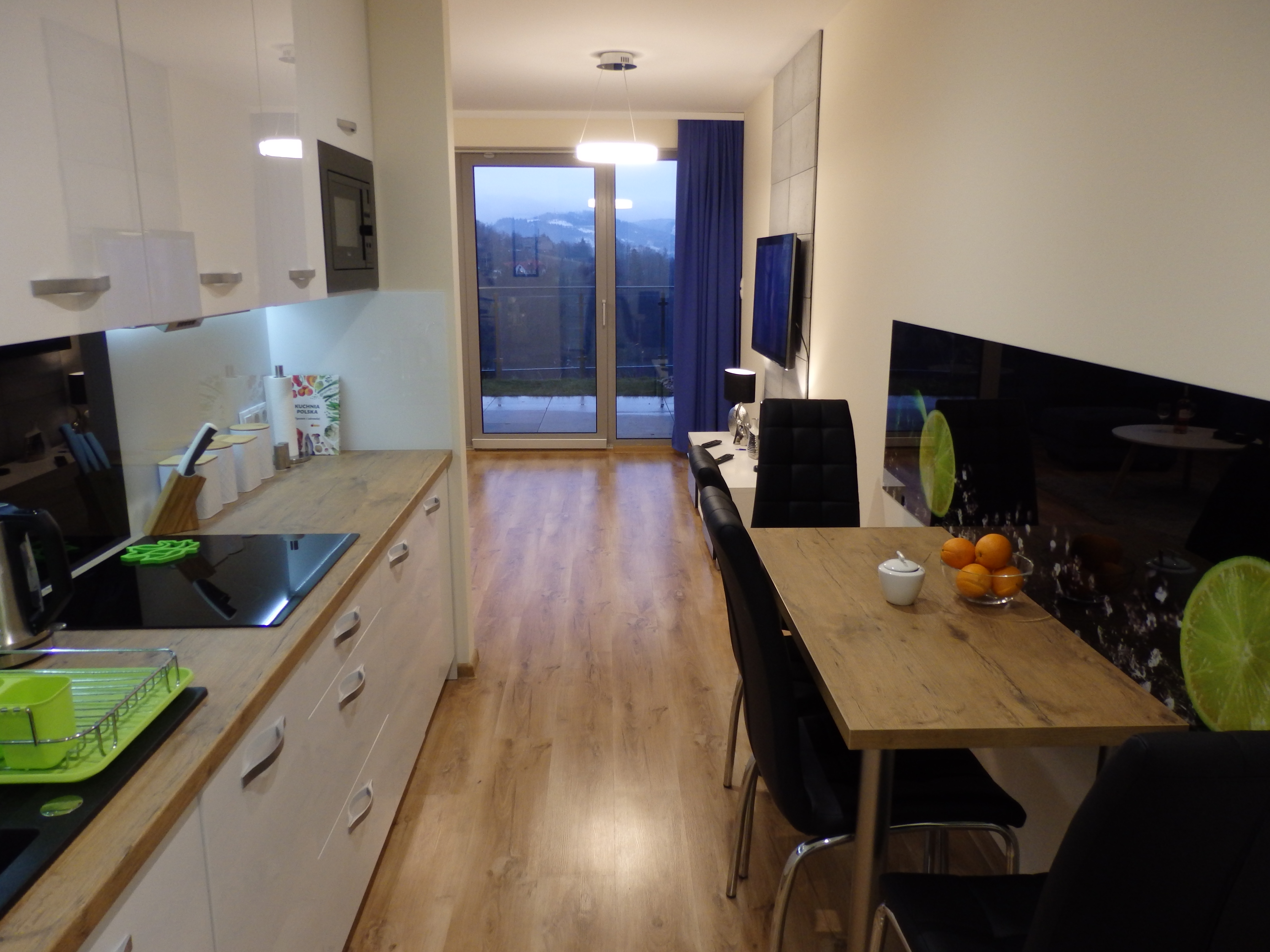 Kuchnia wyposażona jest w płytę indukcyjną, mikrofalówkę, zmywarkę, lodówkę oraz wszystkie niezbędne przybory kuchenne.