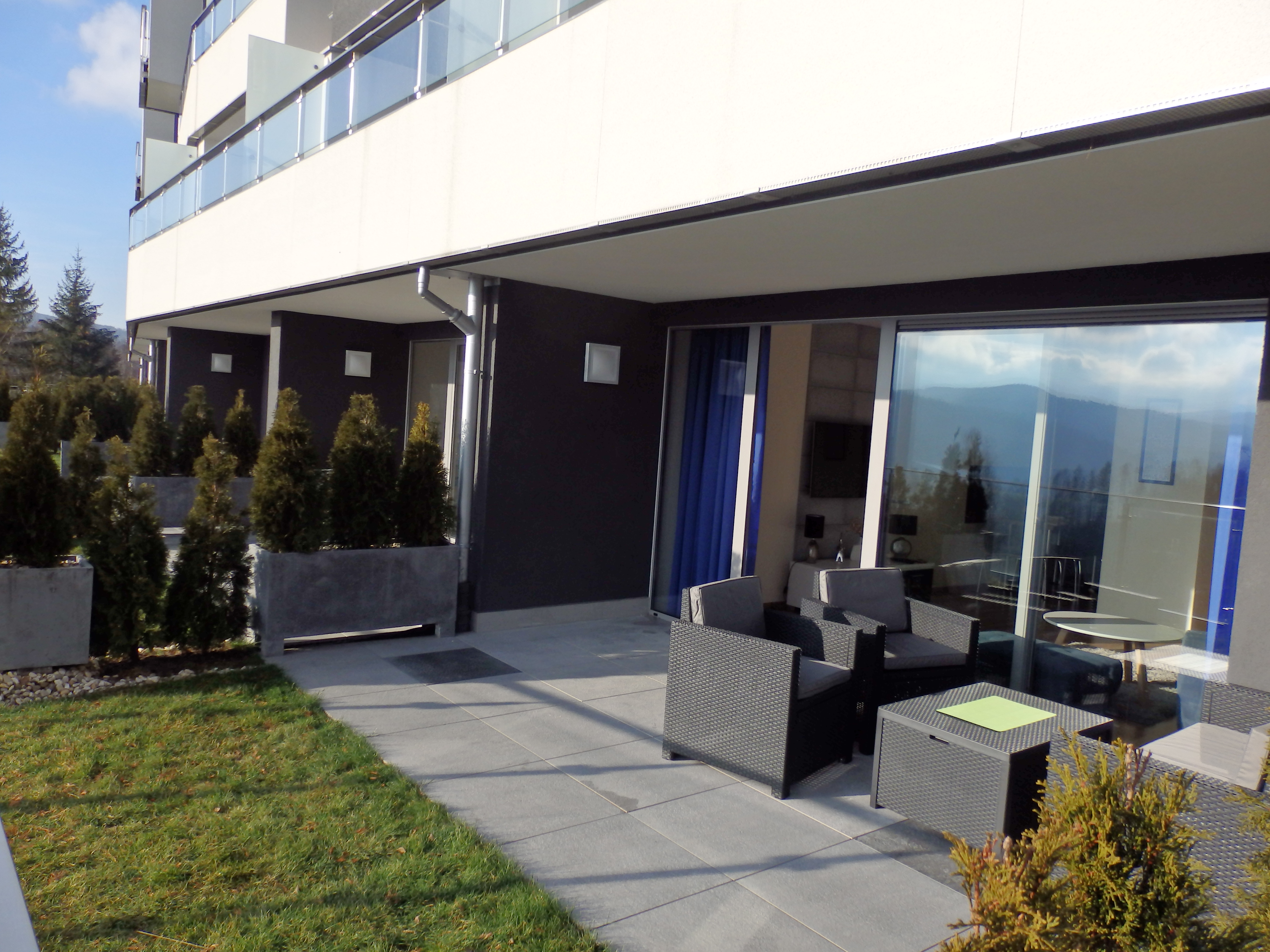 Taras z pięknym widokiem na góry, wyposażony w meble ogrodowe oraz indywidualny, obszerny skiroom ( możliwość wstawienia rowerów ).