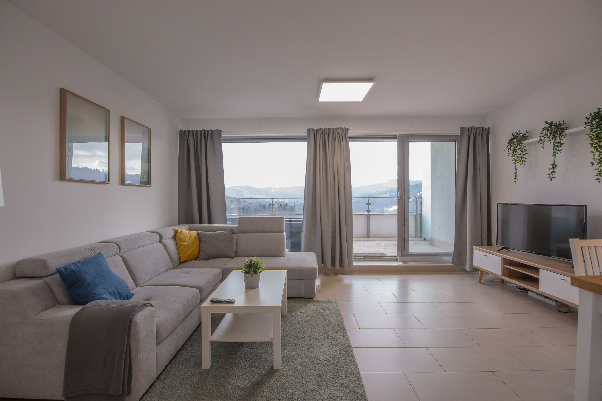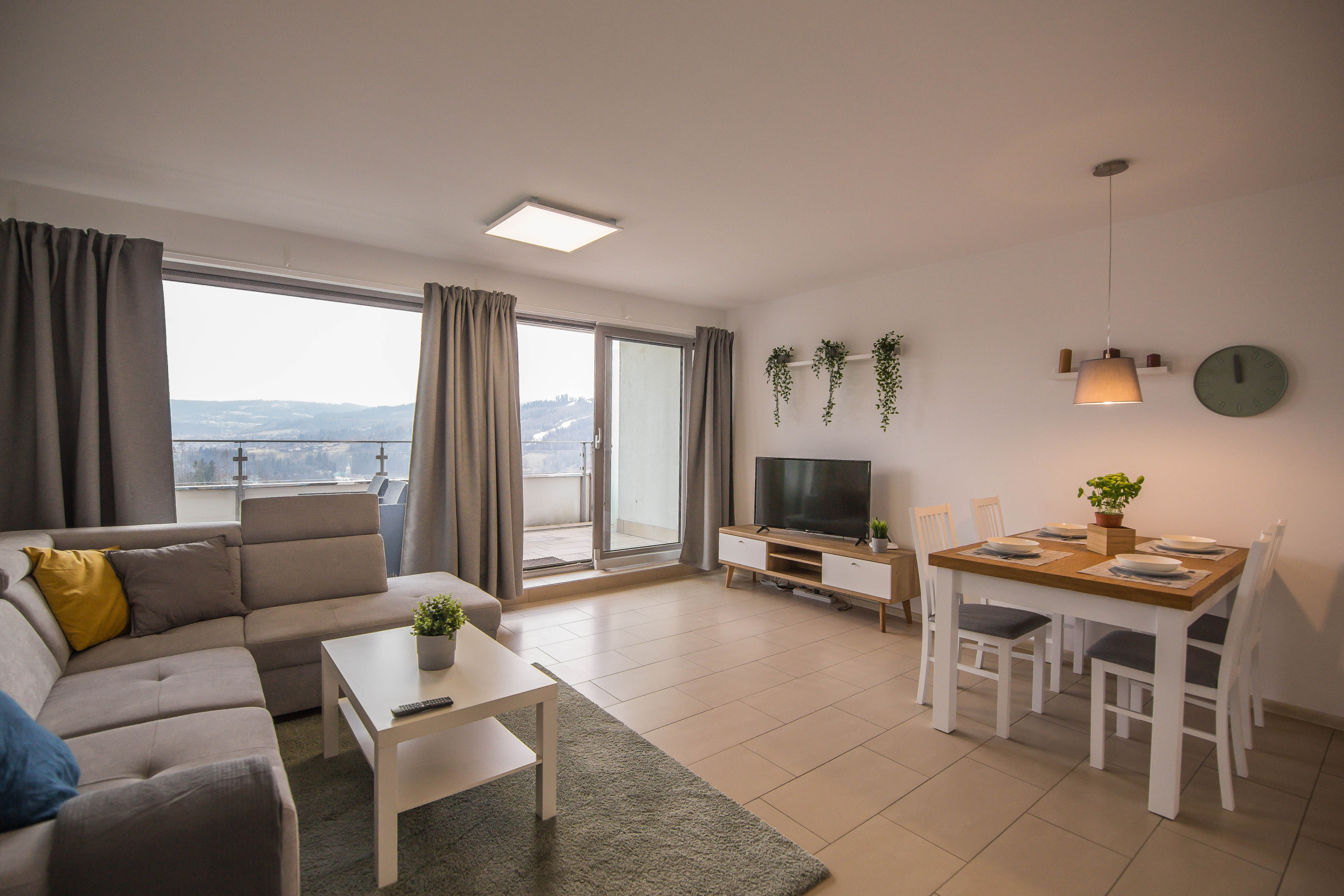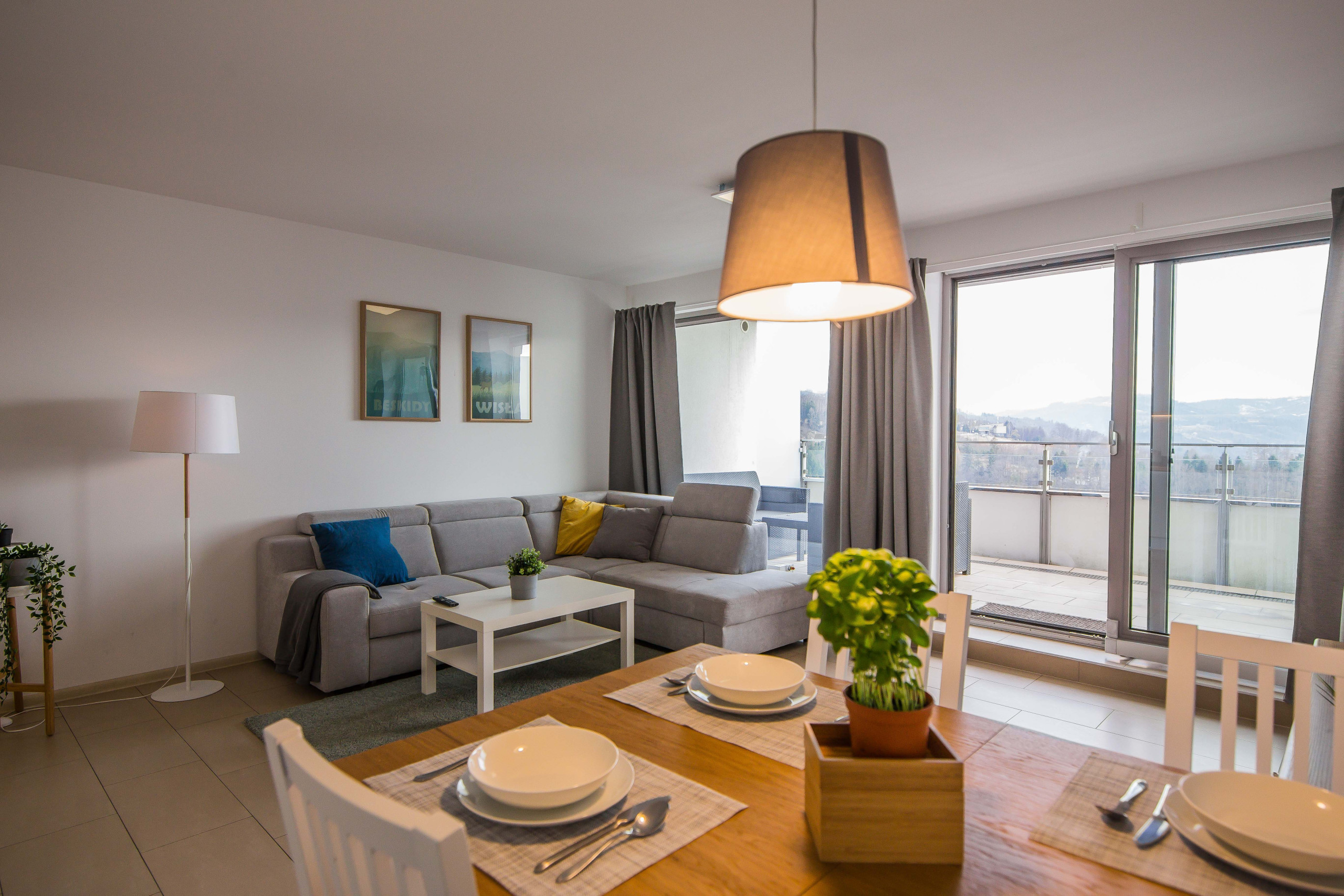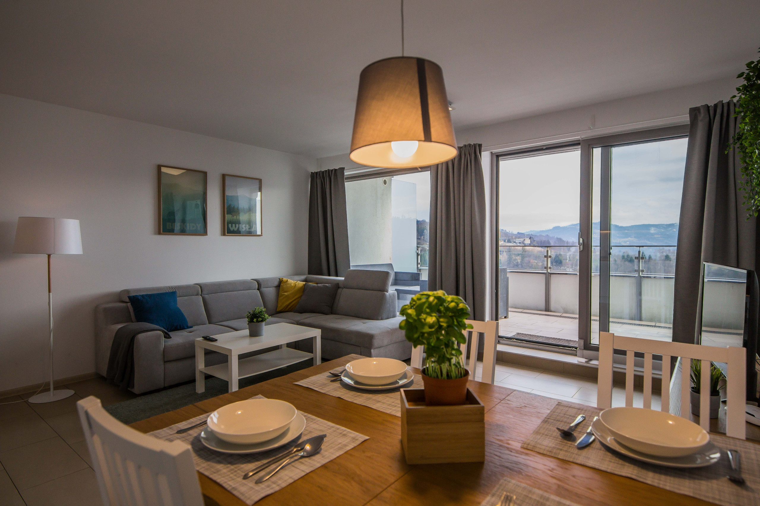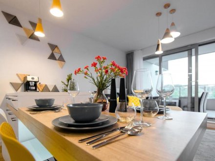 Ten nowoczesny apartament może ugościć do 4 osób - jest to idealny wybór na rodzinny wyjazd lub dla grupy przyjaciół. Wysoce funkcjonalna przestrzeń oferuje salon z aneksem kuchennym, sypialnię oraz łazienkę. Część dzienna wyposażona w wygodną sofę oraz telewizor Smart TV stanowi doskonałe miejsce odpoczynku i relaksu. Do dyspozycji gości jest także przynależny do salonu balkon z meblami ogrodowymi, z którego rozciąga się piękny widok na miasto i góry – to idealne miejsce na łyk porannej kawy, czy odpoczynek po całym dniu zwiedzania. Sypialnia posiada wygodne łóżko małżeńskie i telewizor, aby móc się komfortowo zrelaksować. Znajduje się tu także biurko, dzięki czemu goście pracujący zdalnie będą mogli w komfortowy sposób zadbać o obowiązki służbowe, a w całym apartamencie jest dostęp do szybkiego, bezpłatnego Internetu Wifi. Szeroki wachlarz udogodnień oraz kompleksowe wyposażenie apartamentu w niezbędne akcesoria i sprzęty kuchenne, jak i łazienkowe gwarantuje komfort pobytu. Dla ułatwienia rozpoczęcia każdej wizyty zapewniono bezpłatny zestaw kosmetyków (mydło, szampon i żel pod prysznic), ręczniki oraz pościel. Na wyposażeniu mieszkania goście znajdą również pralkę, co z pewnością docenią rodziny z małymi dziećmi czy osoby planujące dłuższy pobyt. Na życzenie gości w apartamencie będzie czekało łóżeczko dla dziecka, krzesełko do karmienia, wanienka, czy nawet przewijak. Jasne wnętrze mieszkania jest funkcjonalnie zaprojektowane, wychodząc naprzeciw wszelkim potrzebom gości. Istnieje możliwość, aby zabrać na wyjazd swojego ulubionego pupila, gdyż obiekt akceptuje zwierzęta.