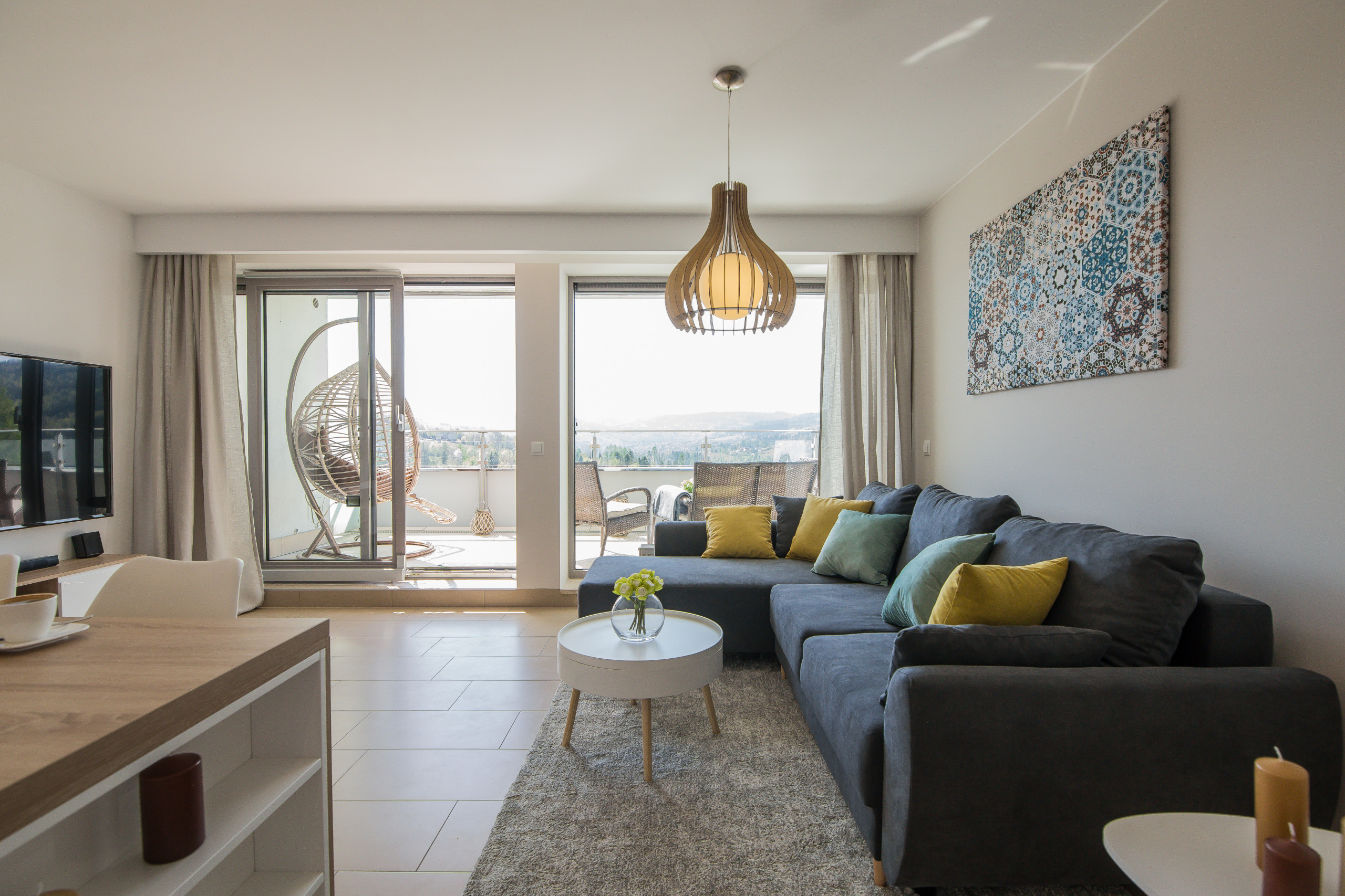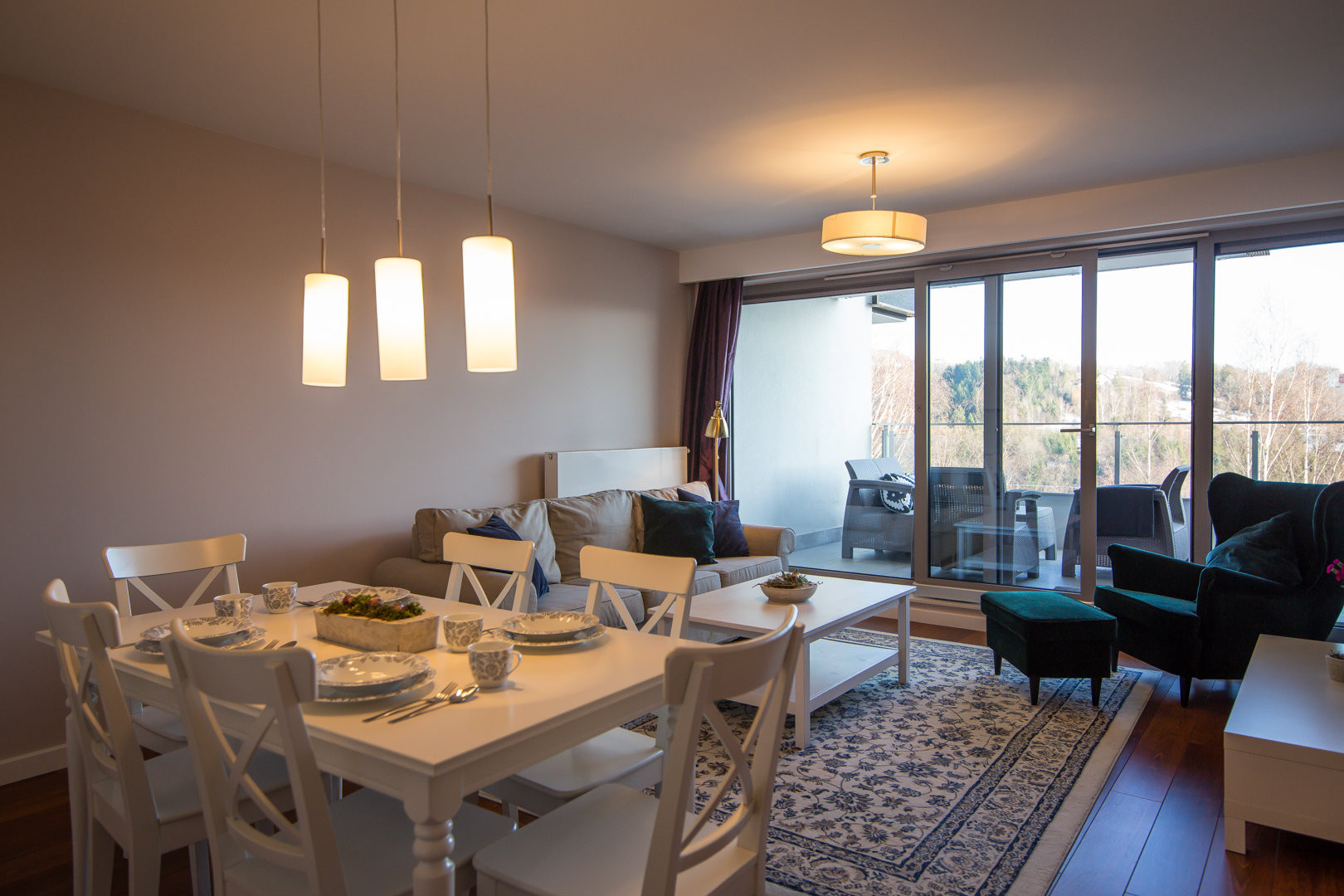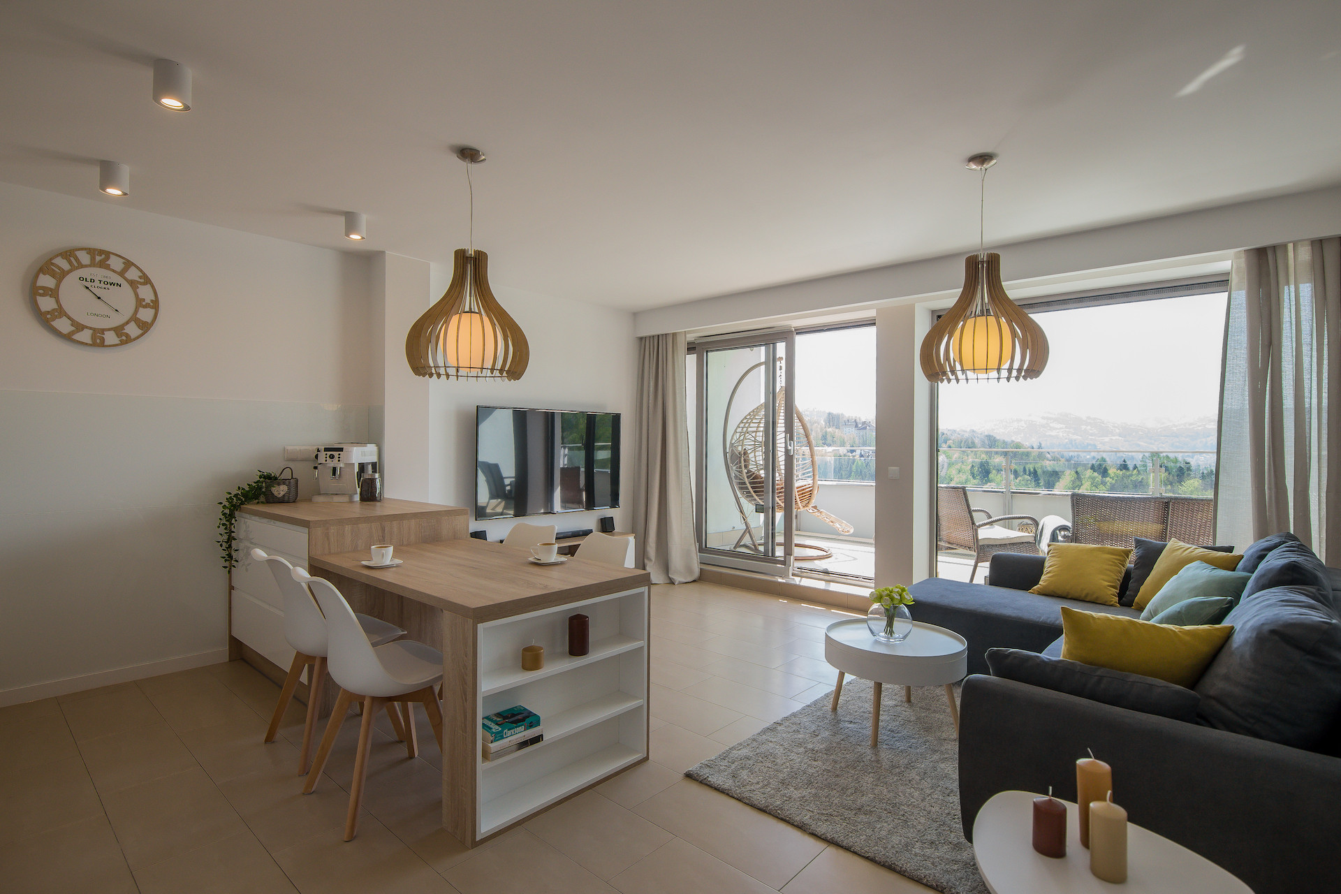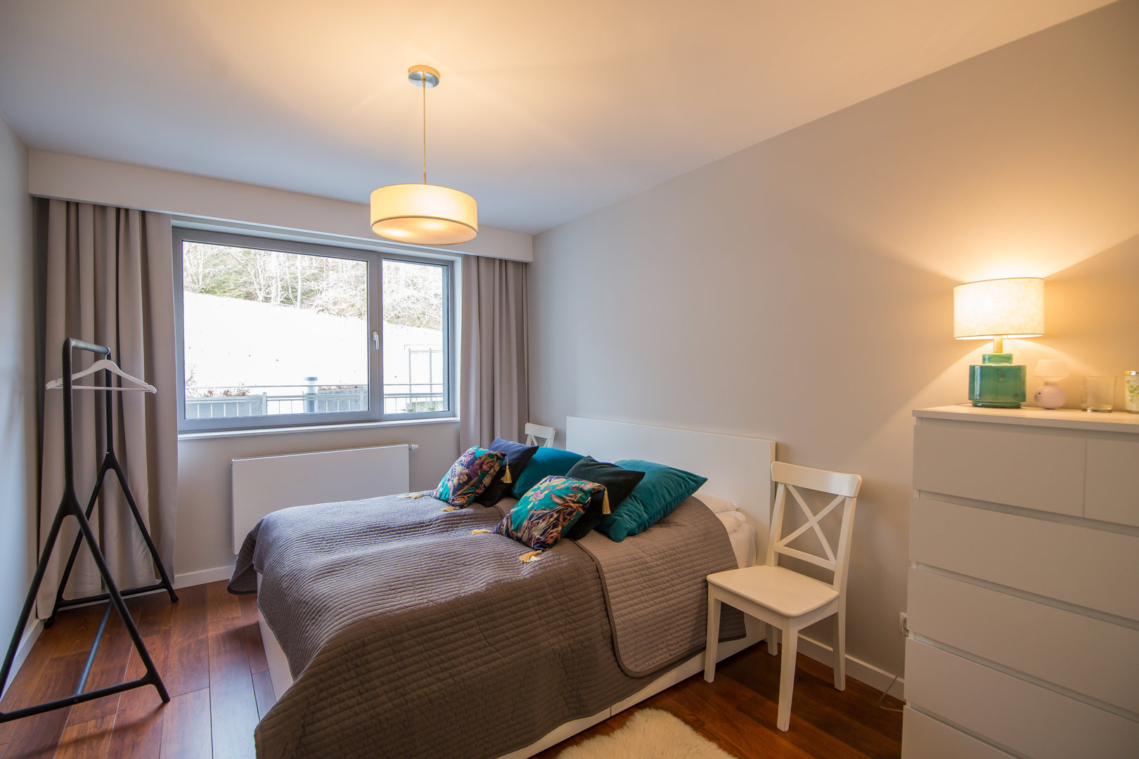 Apartament dla 4 osób znajduje się na parterze budynku. Wnętrze charakteryzuje się połączeniem klasyki z nowoczesnymi akcentami, co tworzy wyjątkową, przytulną atmosferę. Funkcjonalnie zaprojektowana powierzchnia składa się z salonu połączonego z aneksem kuchennym, sypialni oraz łazienka z prysznicem. W części wypoczynkowej znajduje się telewizor oraz wygodna rozkładana sofa. Z salonu można wyjść na balkon, z którego rozciąga się przepiękny widok na panoramę Wisły i gór. Centralnym punktem mieszkania jest jadalnia ze stołem i zestawem krzeseł. Atutem apartamentu jest osobna sypialnia z komfortowym podwójnym łóżkiem, gwarantującym wygodny odpoczynek po aktywnie spędzonym dniu. Goście mają do dyspozycji szybkie i darmowe Wi-Fi. Kuchnia, otwarta na część jadalną, jest przykładem perfekcyjnego wykorzystania przestrzeni. Białe, lakierowane szafki kuchenne idealnie współgrają z jasnobrązowym blatem, co nadaje wnętrzu świeży i czysty wygląd. Apartament wyróżnia się bogatym zestawem udogodnień i kompletnym wyposażeniem kuchennym, które umożliwia przygotowanie domowych posiłków. W łazience zostały przygotowane dla Gości zestaw kosmetyków. Mieszkanie szczególnie przypadnie do gustu osobom podróżującym ze zwierzętami, gdyż dopuszczalny jest pobyt wraz z pupilami.
