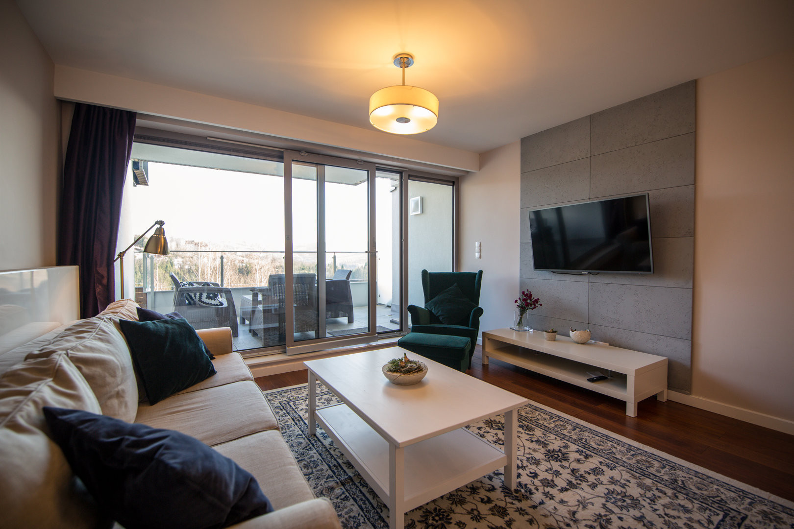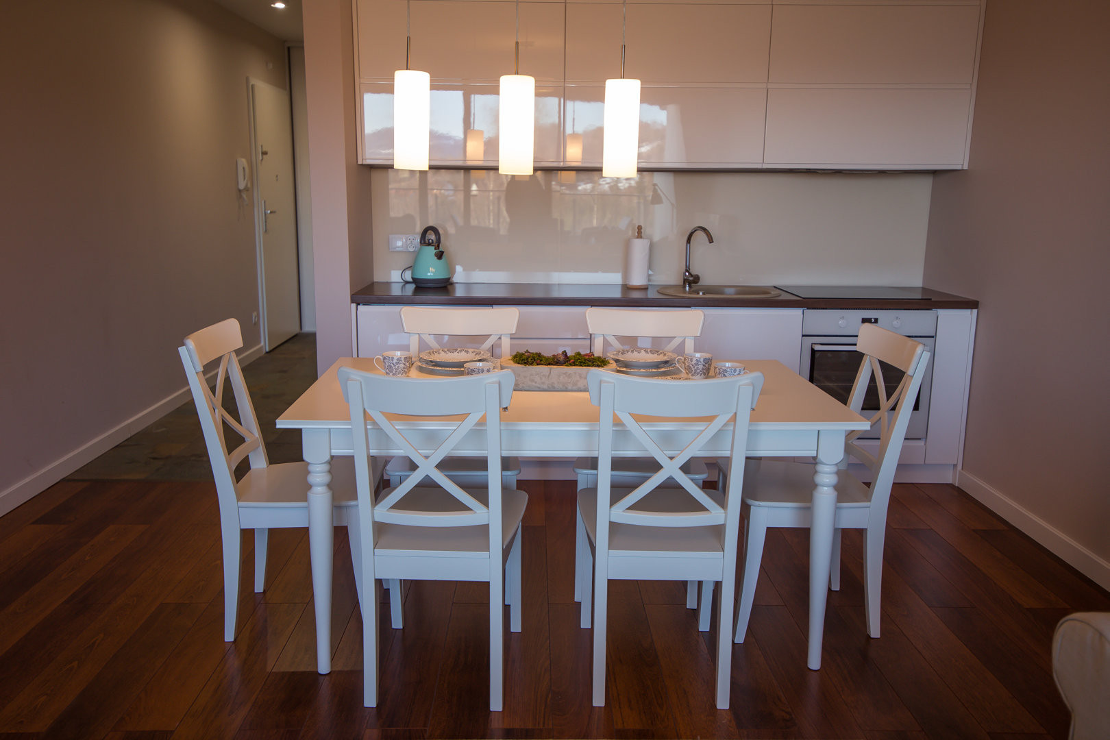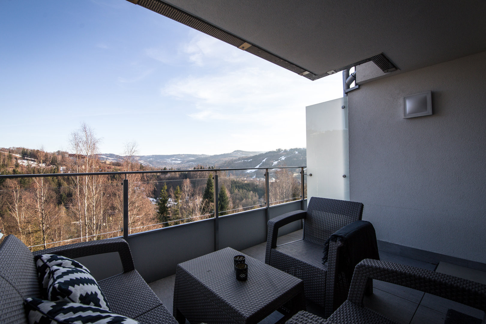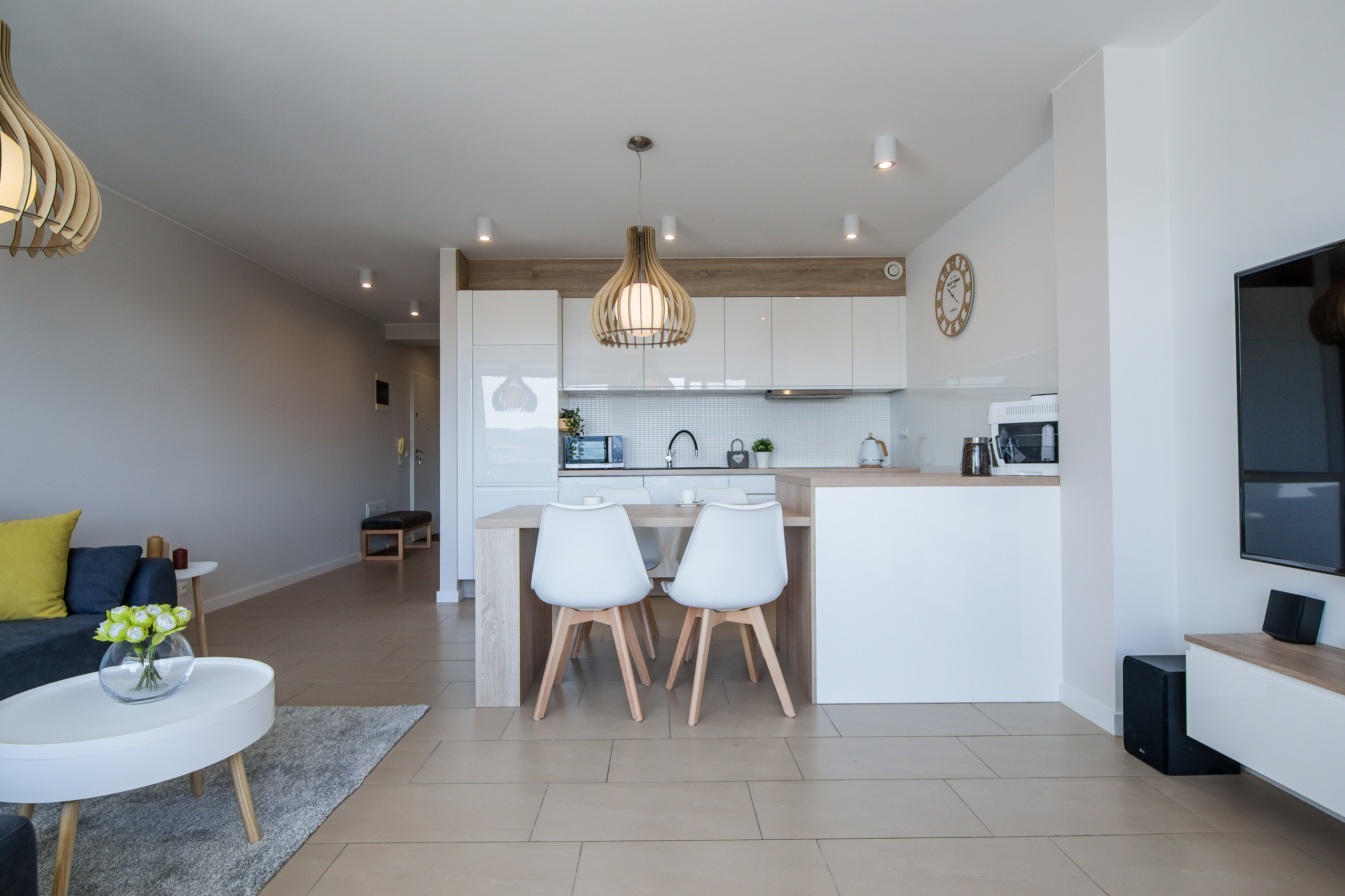 Apartament dla 4 osób znajduje się na parterze budynku. Wnętrze charakteryzuje się połączeniem klasyki z nowoczesnymi akcentami, co tworzy wyjątkową, przytulną atmosferę. Funkcjonalnie zaprojektowana powierzchnia składa się z salonu połączonego z aneksem kuchennym, sypialni oraz łazienka z prysznicem. W części wypoczynkowej znajduje się telewizor oraz wygodna rozkładana sofa. Z salonu można wyjść na balkon, z którego rozciąga się przepiękny widok na panoramę Wisły i gór. Centralnym punktem mieszkania jest jadalnia ze stołem i zestawem krzeseł. Atutem apartamentu jest osobna sypialnia z komfortowym podwójnym łóżkiem, gwarantującym wygodny odpoczynek po aktywnie spędzonym dniu. Goście mają do dyspozycji szybkie i darmowe Wi-Fi. Kuchnia, otwarta na część jadalną, jest przykładem perfekcyjnego wykorzystania przestrzeni. Białe, lakierowane szafki kuchenne idealnie współgrają z jasnobrązowym blatem, co nadaje wnętrzu świeży i czysty wygląd. Apartament wyróżnia się bogatym zestawem udogodnień i kompletnym wyposażeniem kuchennym, które umożliwia przygotowanie domowych posiłków. W łazience zostały przygotowane dla Gości zestaw kosmetyków. Mieszkanie szczególnie przypadnie do gustu osobom podróżującym ze zwierzętami, gdyż dopuszczalny jest pobyt wraz z pupilami.