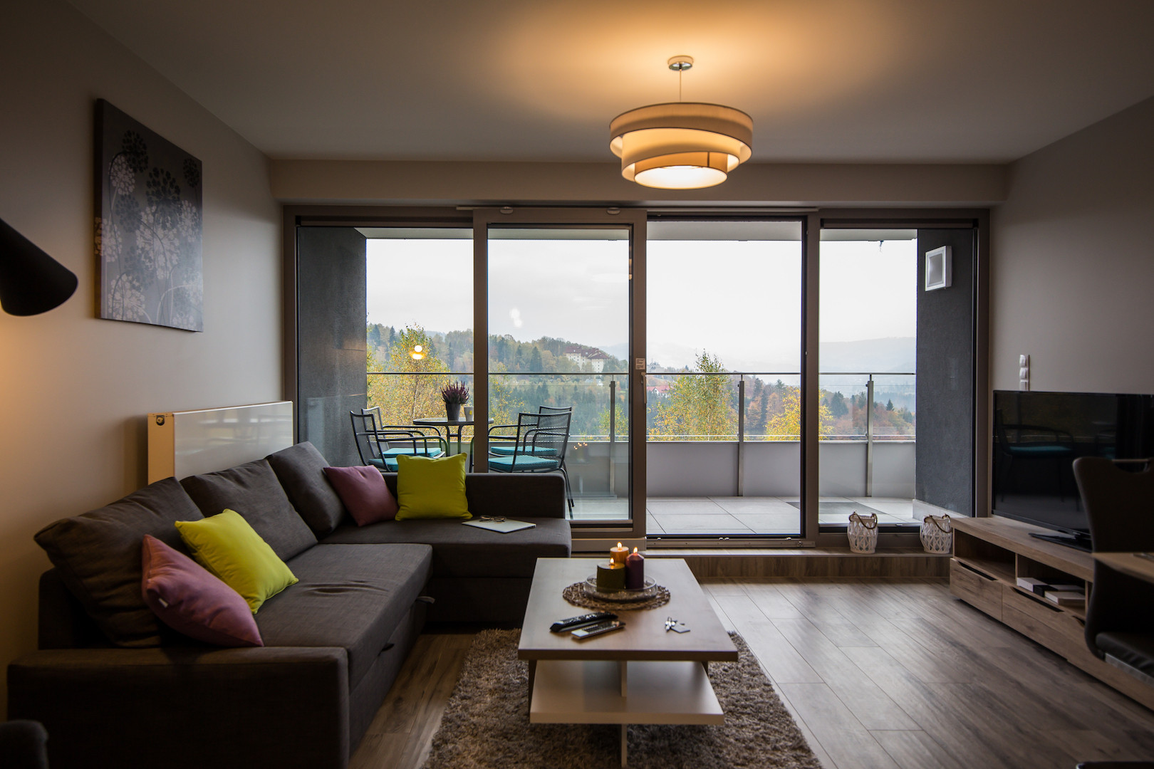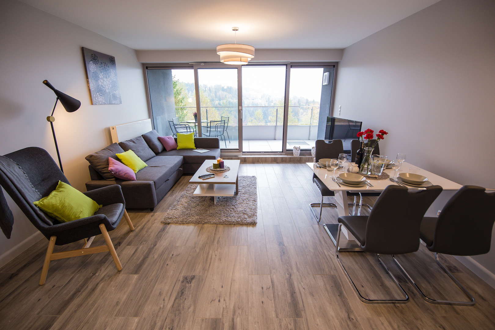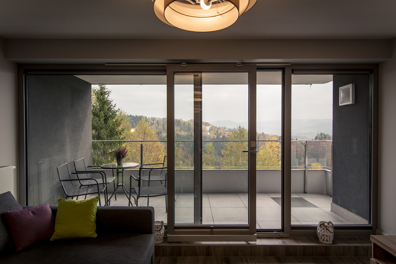 Apartament dla 4 osób znajduje się na parterze budynku. Wchodząc do tego przestronnego apartamentu, od razu rzuca się w oczy otwarta przestrzeń, która płynnie łączy ze sobą salon, jadalnię i kuchnię, tworząc idealne miejsce do życia i rozrywki. Naturalne światło rozświetla pomieszczenie dzięki dużym, panoramicznym oknom, które oferują także zachwycający widok na okolicę. Salon zachęca do relaksu, dzięki wygodnej, nowoczesnej sofie i stylowemu fotelowi, które otaczają elegancki stolik kawowy. Z salonu można wyjść na balkon, z którego rozciąga się przepiękny widok na panoramę Wisły i gór. Sypialnia to oaza spokoju, z dużym, wygodnym łóżkiem, zapewniającym regenerujący sen. Miękkie tkaniny oraz przyjemnie kontrastująca z białymi ścianami pastelowa pościel sprzyjają relaksacji i wypoczynkowi. Przestronna szafa oferuje mnóstwo miejsca na przechowywanie. Dodatkowo w sypialni znajduje się telewizor, który spodoba się wszystkim miłośnikom filmów. Goście mają do dyspozycji szybkie i darmowe Wi-Fi. Apartament wyróżnia się bogatym zestawem udogodnień i kompletnym wyposażeniem kuchennym, co umożliwia przygotowanie domowych posiłków. W łazience zostały przygotowane dla Gości zestaw kosmetyków. Apartament jest przyjazny zwierzętom.