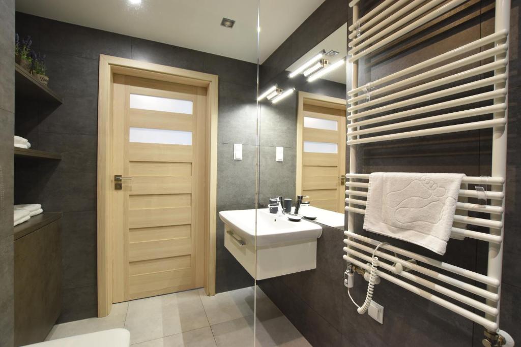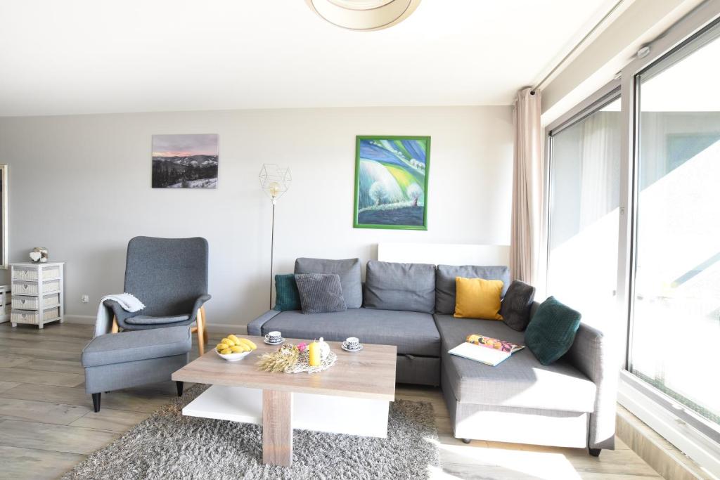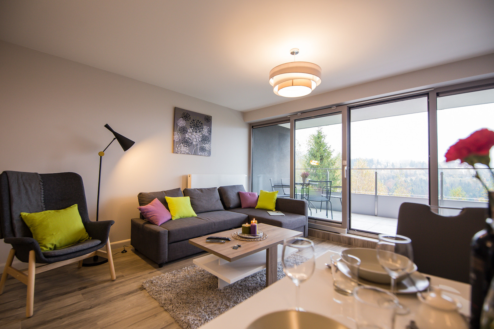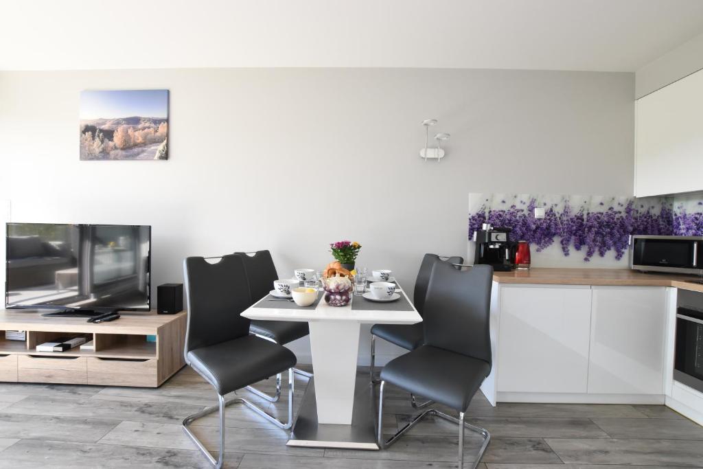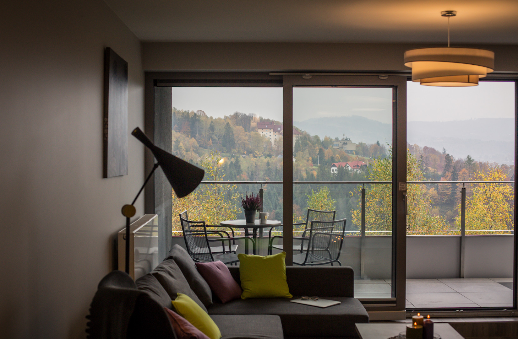 Apartament dla 4 osób znajduje się na parterze budynku. Wchodząc do tego przestronnego apartamentu, od razu rzuca się w oczy otwarta przestrzeń, która płynnie łączy ze sobą salon, jadalnię i kuchnię, tworząc idealne miejsce do życia i rozrywki. Naturalne światło rozświetla pomieszczenie dzięki dużym, panoramicznym oknom, które oferują także zachwycający widok na okolicę. Salon zachęca do relaksu, dzięki wygodnej, nowoczesnej sofie i stylowemu fotelowi, które otaczają elegancki stolik kawowy. Z salonu można wyjść na balkon, z którego rozciąga się przepiękny widok na panoramę Wisły i gór. Sypialnia to oaza spokoju, z dużym, wygodnym łóżkiem, zapewniającym regenerujący sen. Miękkie tkaniny oraz przyjemnie kontrastująca z białymi ścianami pastelowa pościel sprzyjają relaksacji i wypoczynkowi. Przestronna szafa oferuje mnóstwo miejsca na przechowywanie. Dodatkowo w sypialni znajduje się telewizor, który spodoba się wszystkim miłośnikom filmów. Goście mają do dyspozycji szybkie i darmowe Wi-Fi. Apartament wyróżnia się bogatym zestawem udogodnień i kompletnym wyposażeniem kuchennym, co umożliwia przygotowanie domowych posiłków. W łazience zostały przygotowane dla Gości zestaw kosmetyków. Apartament jest przyjazny zwierzętom.
