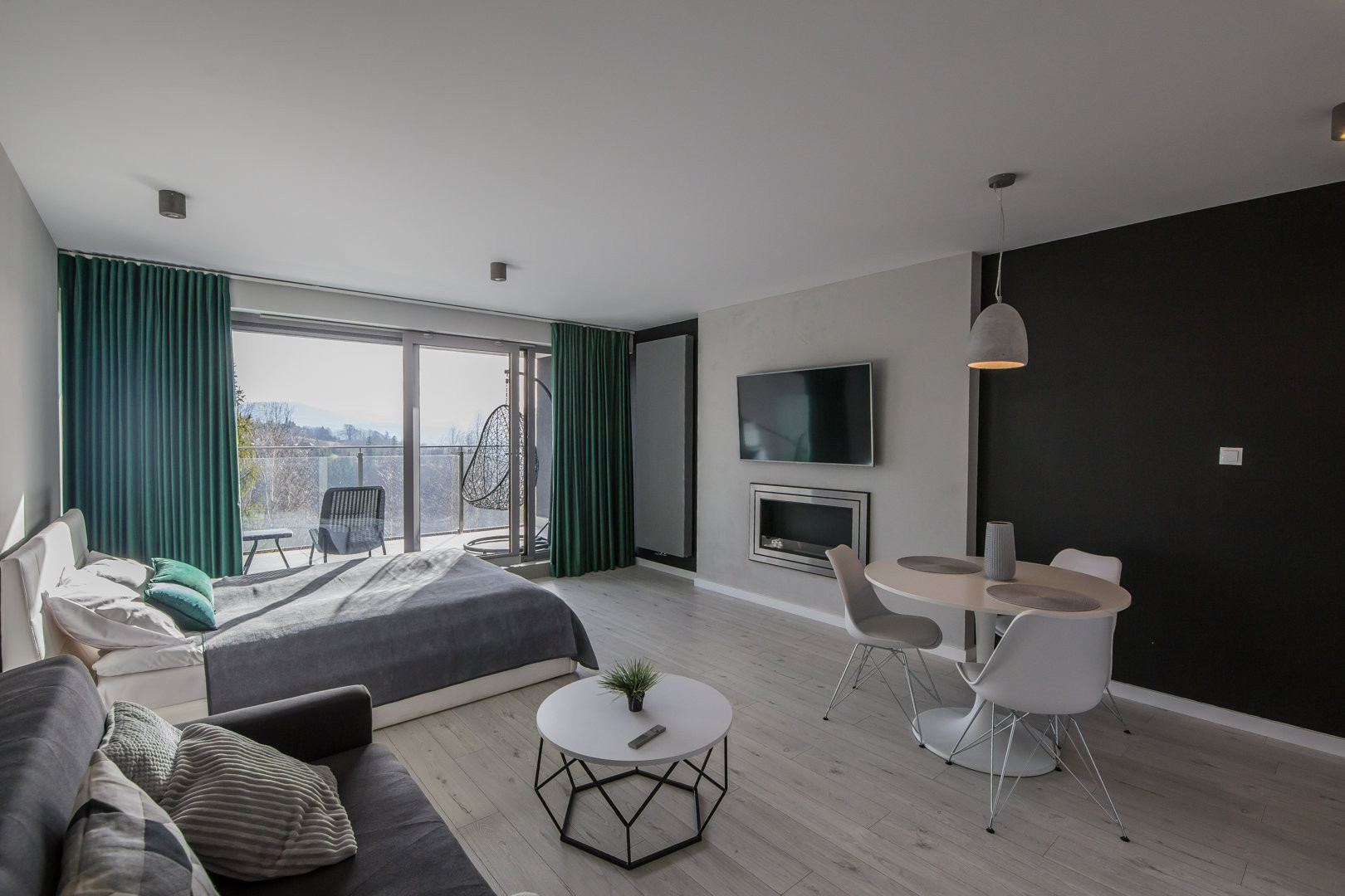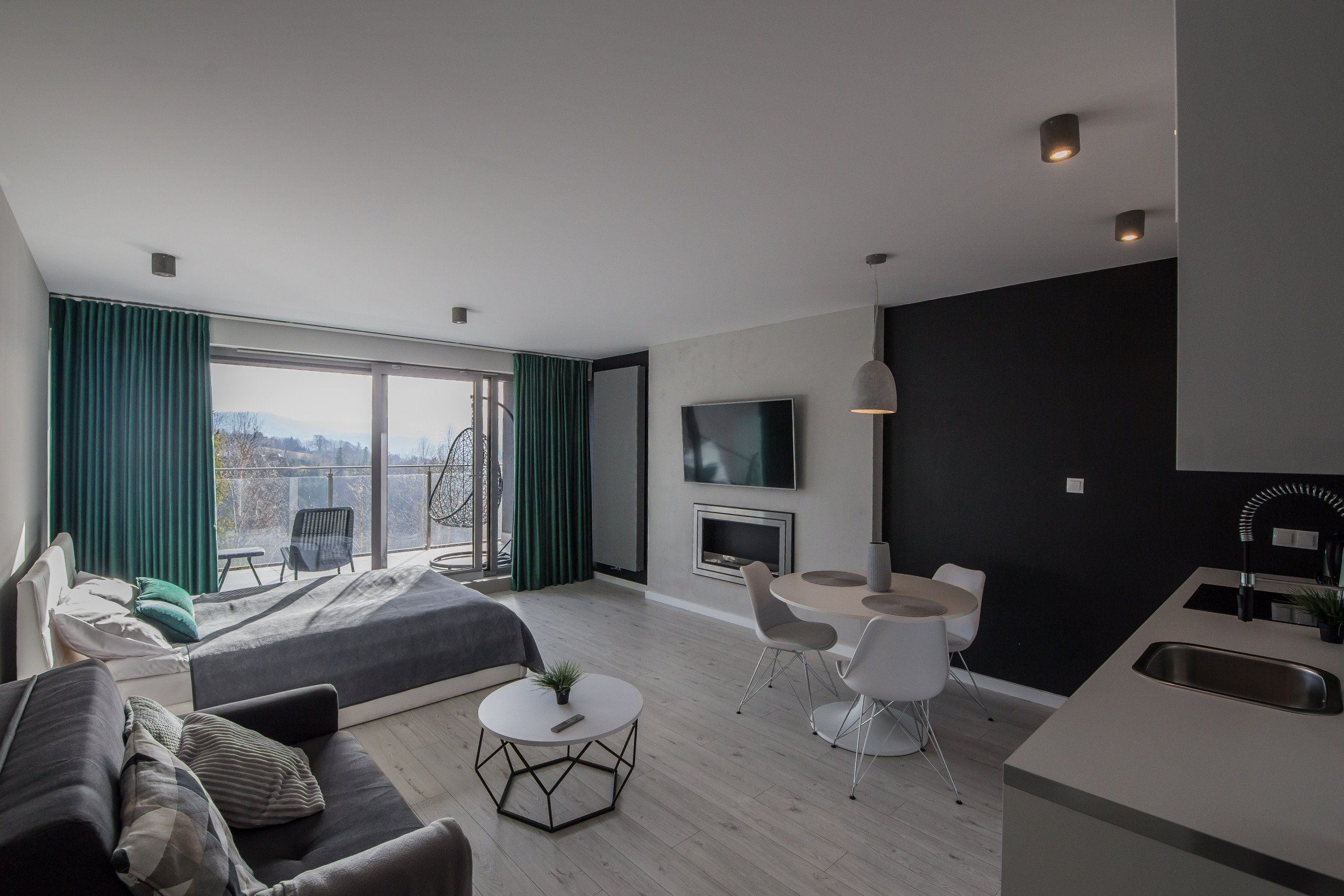 Apartament typu studio charakteryzuje przestronne wnętrze, w którym dominuje eleganckie łóżko małżeńskie. To właśnie ono jest sercem tego miejsca, zapewniając maksymalny komfort wypoczynku po dniu pełnym wrażeń. Naprzeciwko łóżka znajduje się nowoczesny telewizor, dzięki któremu wieczory mogą być jeszcze przyjemniejsze. Można się zrelaksować, oglądając ulubione filmy czy seriale. Studio dysponuje również w pełni wyposażonym aneksem kuchennym, który umożliwia przygotowanie ulubionych posiłków w dowolnym momencie. Aneks kuchenny zawiera niezbędne sprzęty, takie jak lodówka, płyta grzewcza, a także zestaw naczyń i sztućców. Jest to wyjątkowo praktyczne rozwiązanie, szczególnie dla osób, które cenią sobie niezależność. Komfortowe użytkowanie studia zapewnia również funkcjonalna łazienka z nowoczesnym prysznicem. Jest ona wyposażona w ręczniki oraz podstawowe środki higieniczne, co sprawia, że każdy pobyt jest wygodny i bezproblemowy. Apartament jest przyjazny zwierzętom.