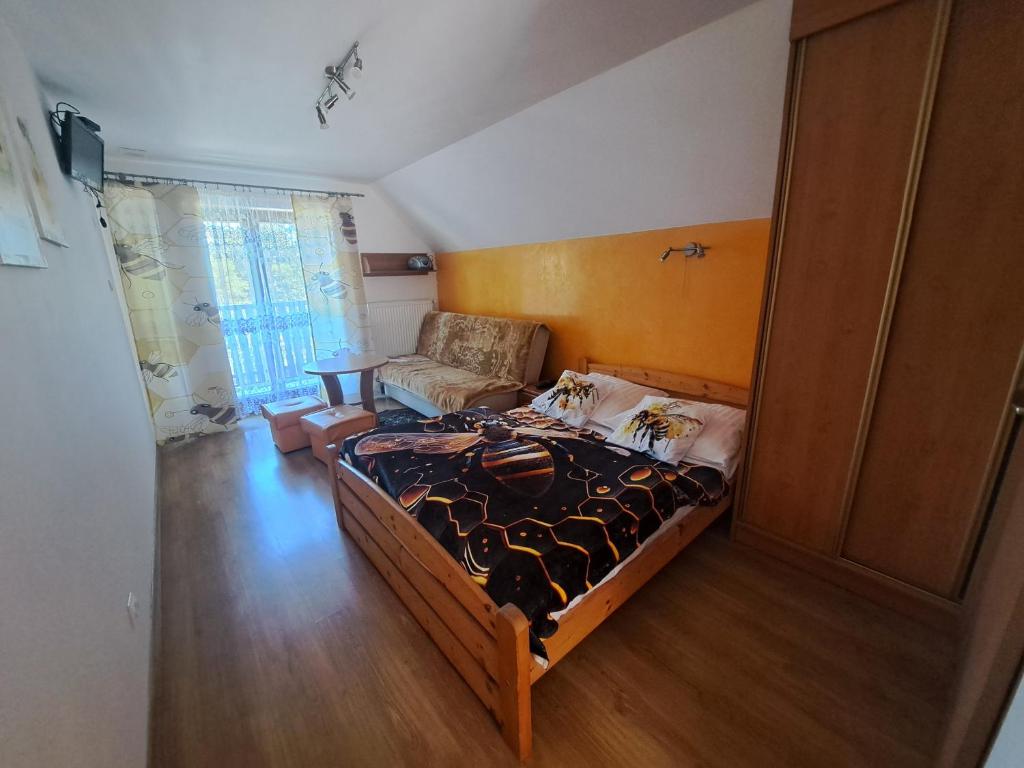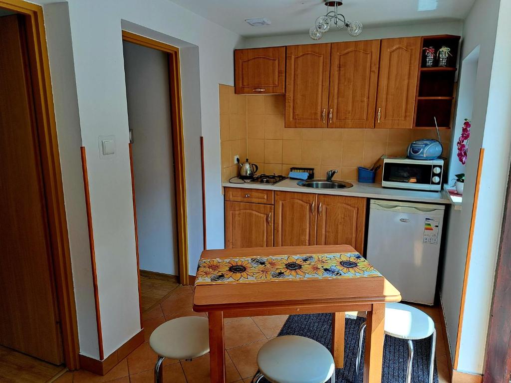 Domek Miodu Mi Daj Apartament oferuje dwie sypialnie, aneks kuchenny z jadalnią oraz dwie łazienki.