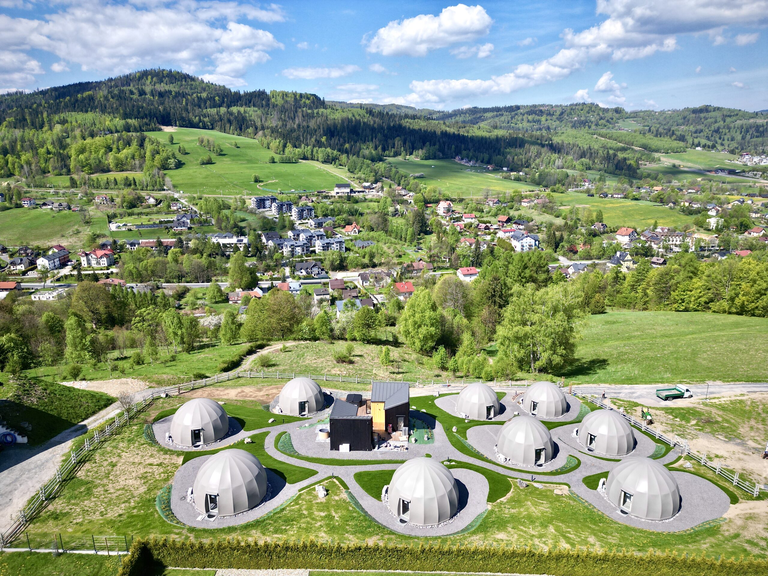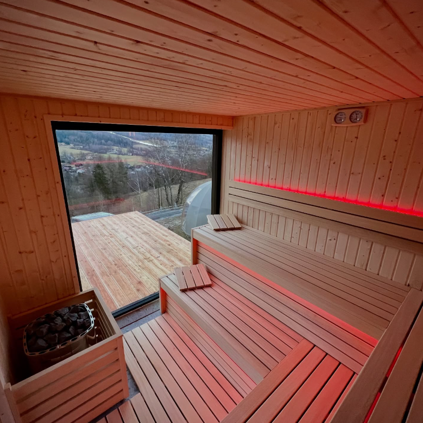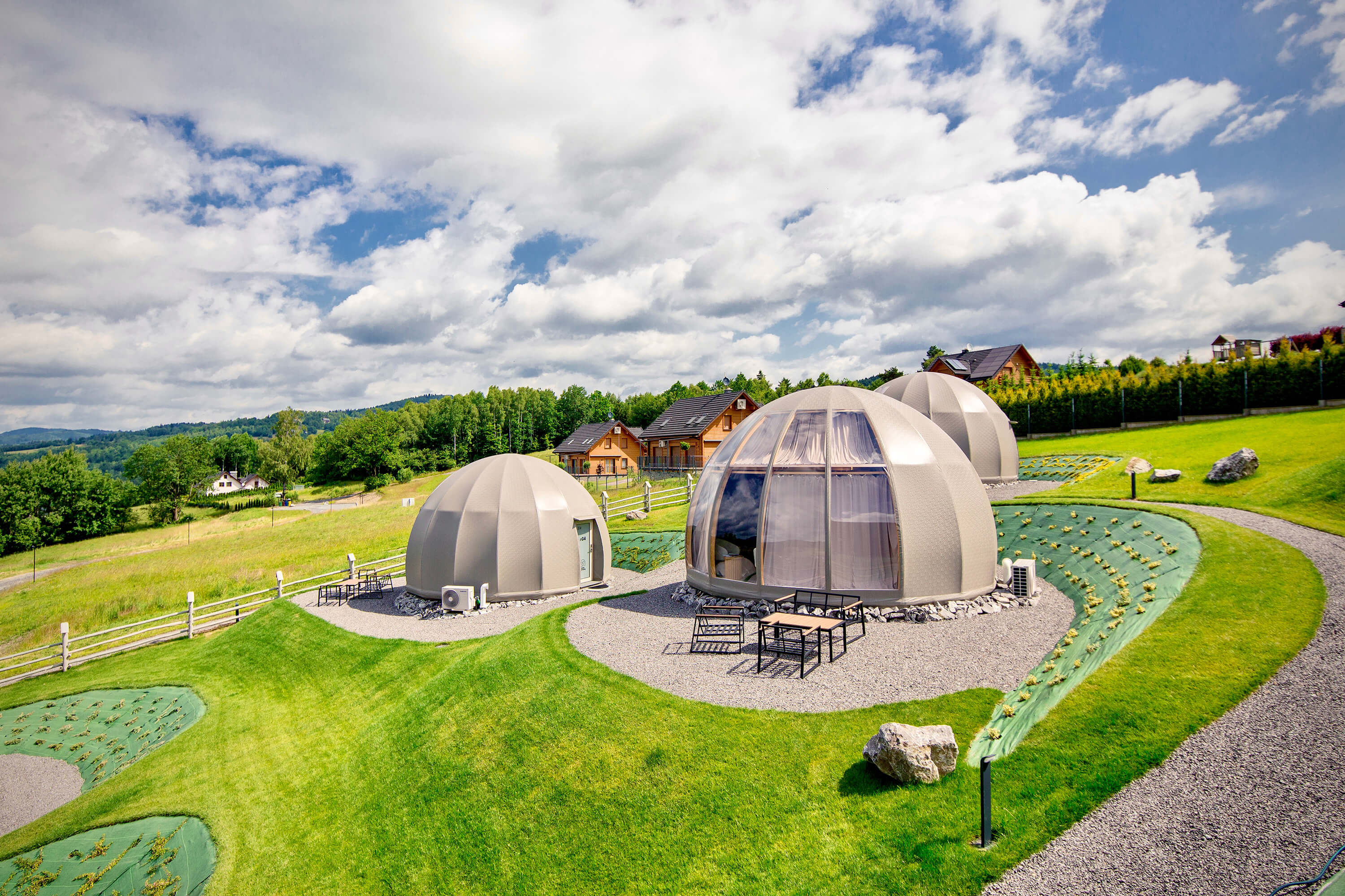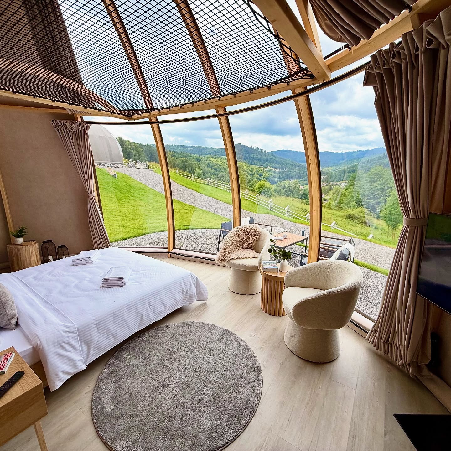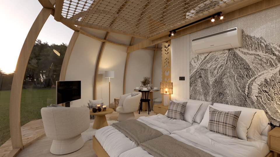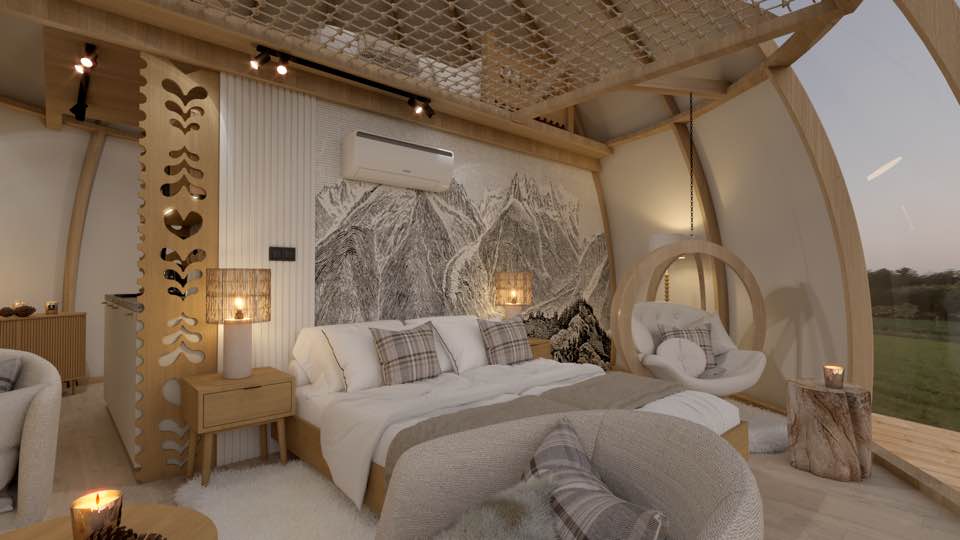 Nasze glampy zostały zaprojektowane i wybudowane z pasją i wielką dbałością o nawet najmniejsze detale. Wykonane zostały przez lokalne firmy oraz miejscowych rzemieślników. Funkcjonalnie glamp to luksusowy apartament z wygodnym podwójnym łóżkiem na parterze oraz dwoma pojedynczymi łóżkami na antresoli. Przestrzeń wewnątrz naszego glampa jest o wiele większa aniżeli w większości ekskluzywnych apartamentów. Zapewnia to kształt kuli potęgujący poczucie relaksu i komfortu. Wszystko to sprawia, że wypoczynek nabiera niepowtarzalnego charakteru. Do tego dochodzi zapierający dech widok przepięknej panoramy Beskidu Śląskiego, który podziwiać można na wiele sposobów: siedząc w glampie w wygodnym fotelu; pufie; wylegując się błogo w łóżku lub na hamaku/siatce, która znajduje się na antresoli. Możliwy jest także wypoczynek na swoim prywatnym tarasie przed glampem lub na leżaku w strefie wellness. W glampach znajduje się wygodny aneks kuchenny (lodówka, kuchenka mikrofalowa, płyta indukcyjna, dzbanek elektryczny), smart TV, system klimatyzacji i ogrzewania wraz z rekuperacją oraz komfortowa łazienka.