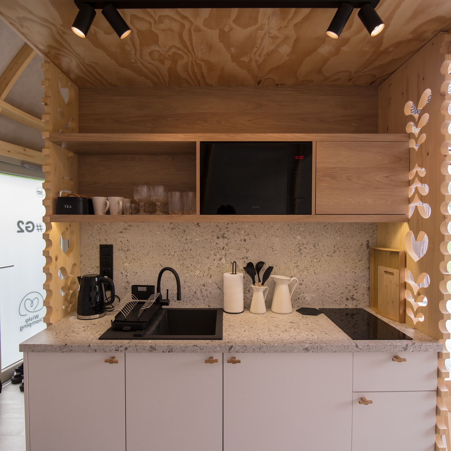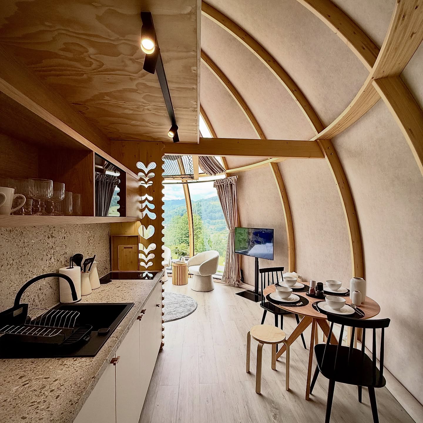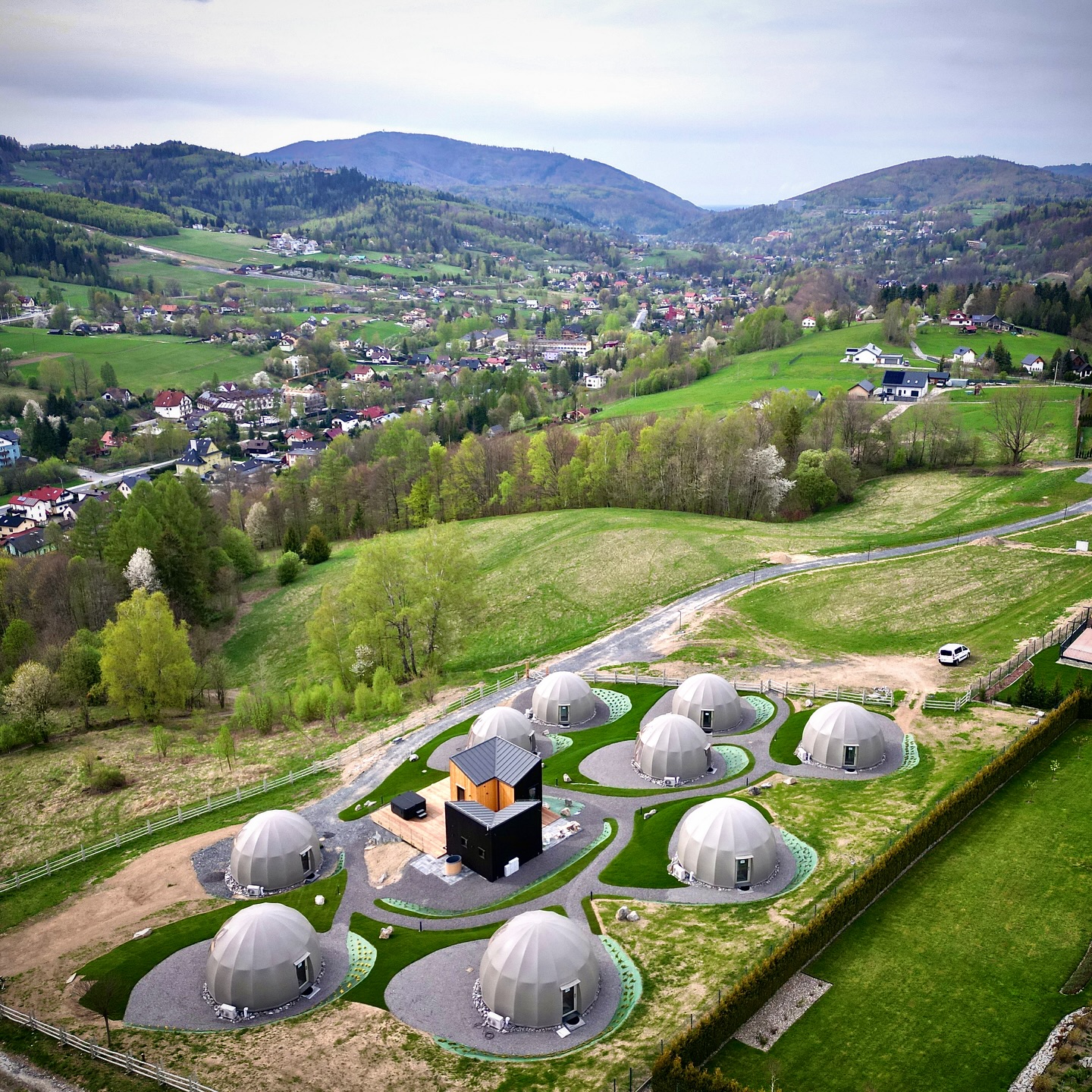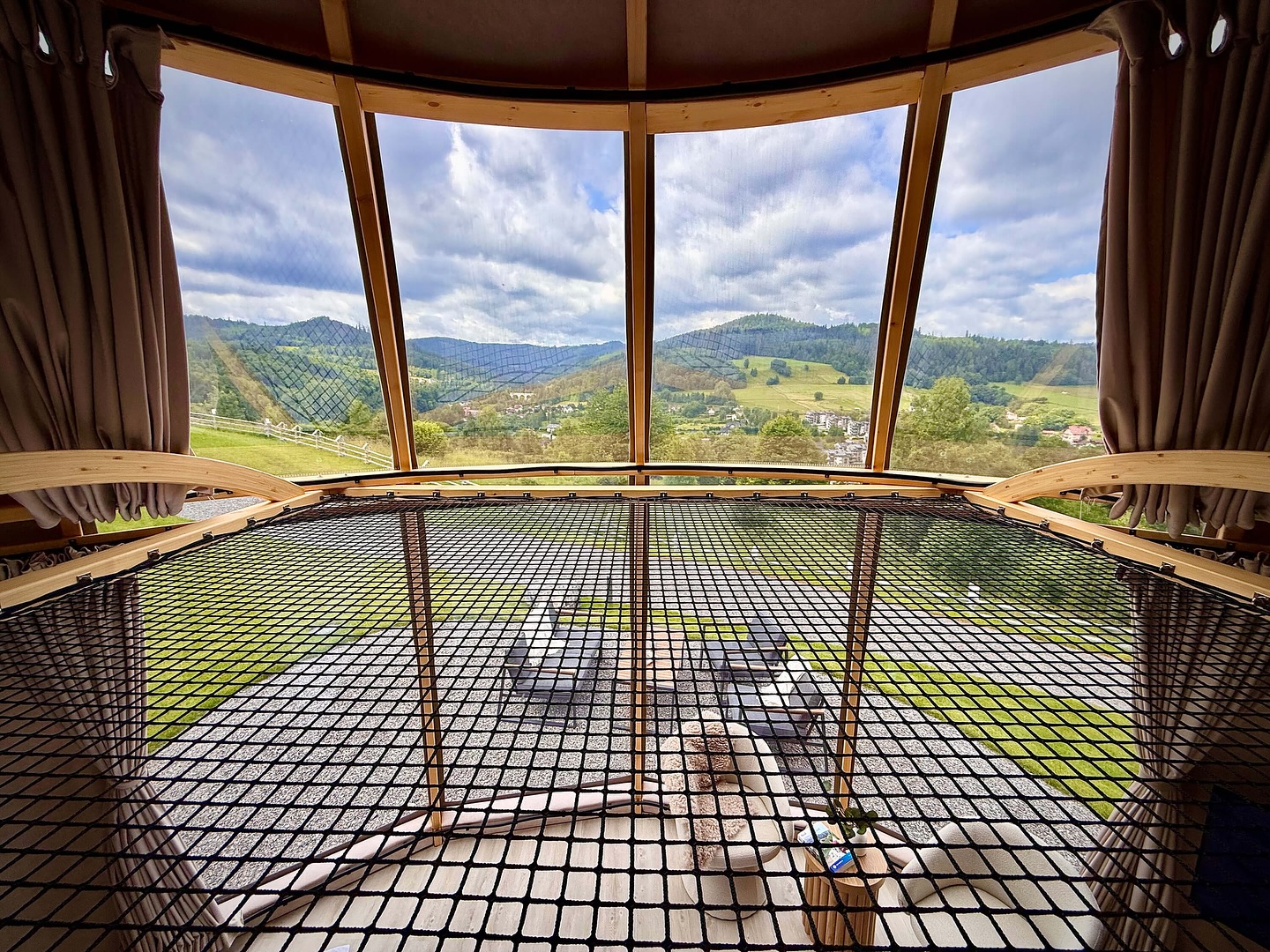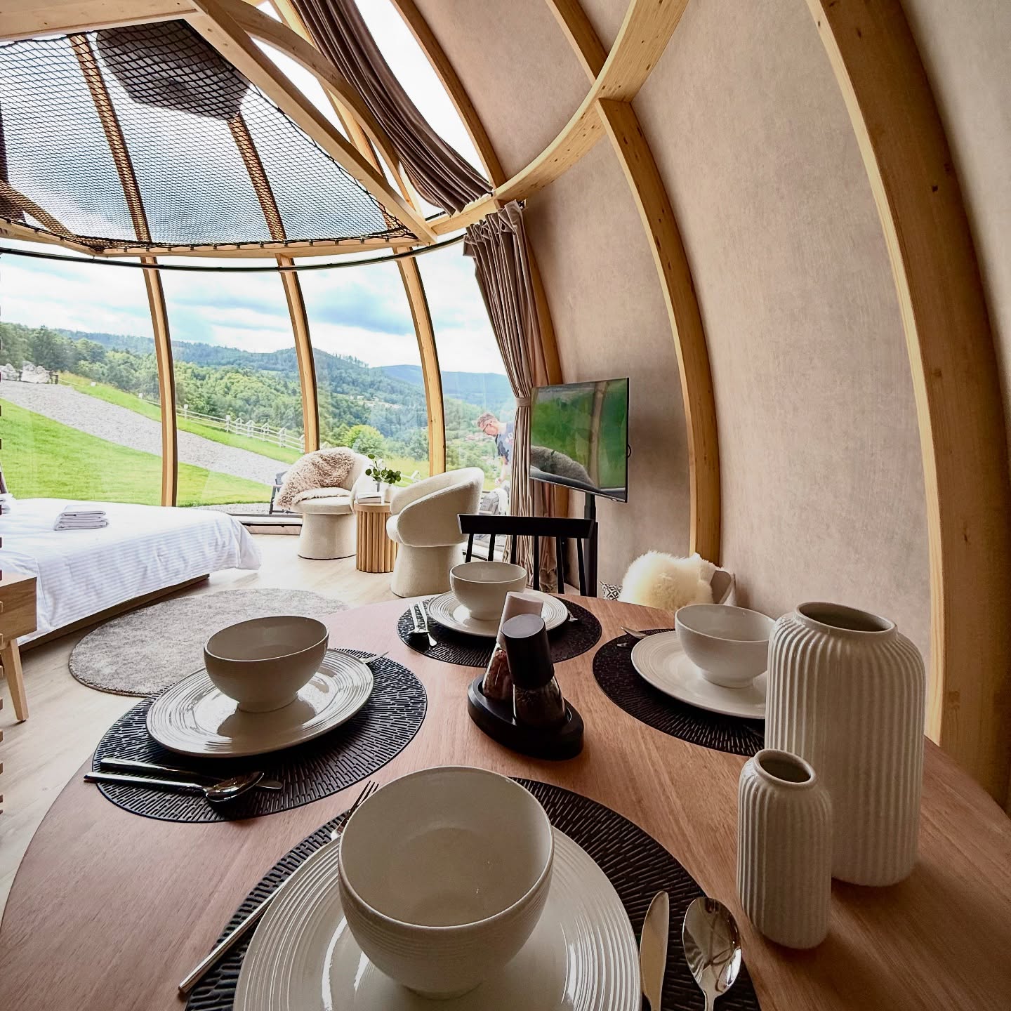 Nasze glampy zostały zaprojektowane i wybudowane z pasją i wielką dbałością o nawet najmniejsze detale. Wykonane zostały przez lokalne firmy oraz miejscowych rzemieślników. Funkcjonalnie glamp to luksusowy apartament z wygodnym podwójnym łóżkiem na parterze oraz dwoma pojedynczymi łóżkami na antresoli. Przestrzeń wewnątrz naszego glampa jest o wiele większa aniżeli w większości ekskluzywnych apartamentów. Zapewnia to kształt kuli potęgujący poczucie relaksu i komfortu. Wszystko to sprawia, że wypoczynek nabiera niepowtarzalnego charakteru. Do tego dochodzi zapierający dech widok przepięknej panoramy Beskidu Śląskiego, który podziwiać można na wiele sposobów: siedząc w glampie w wygodnym fotelu; pufie; wylegując się błogo w łóżku lub na hamaku/siatce, która znajduje się na antresoli. Możliwy jest także wypoczynek na swoim prywatnym tarasie przed glampem lub na leżaku w strefie wellness. W glampach znajduje się wygodny aneks kuchenny (lodówka, kuchenka mikrofalowa, płyta indukcyjna, dzbanek elektryczny), smart TV, system klimatyzacji i ogrzewania wraz z rekuperacją oraz komfortowa łazienka.