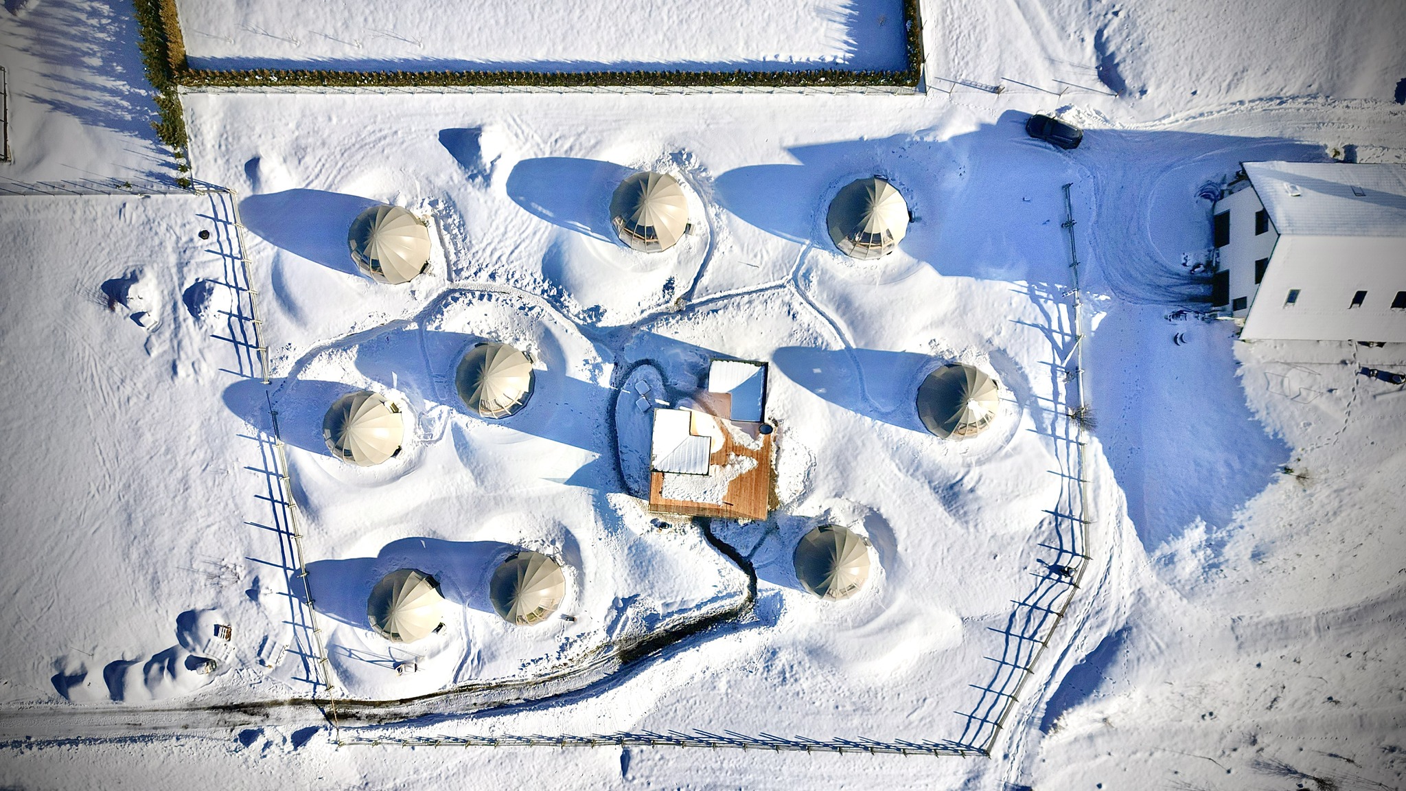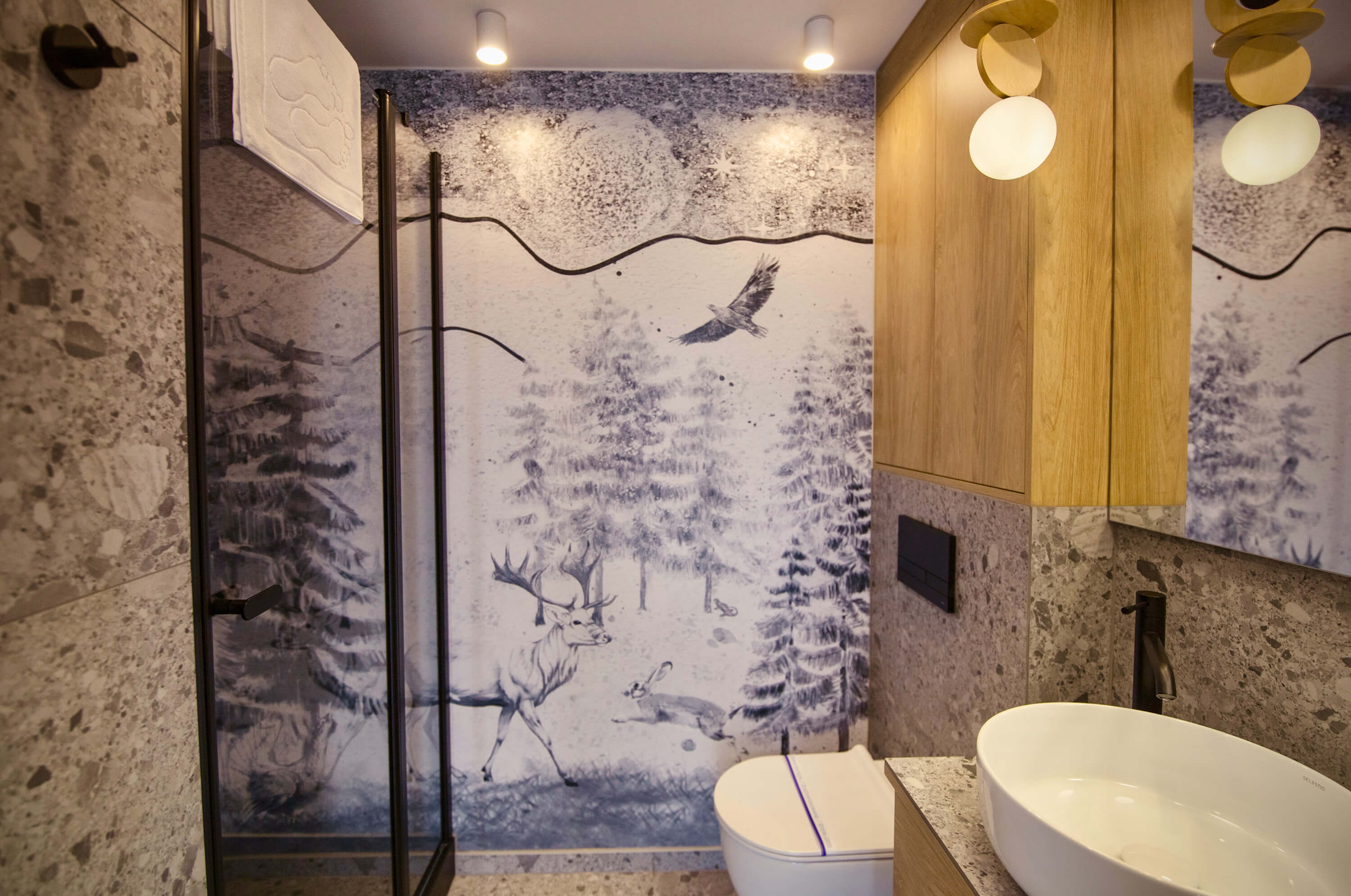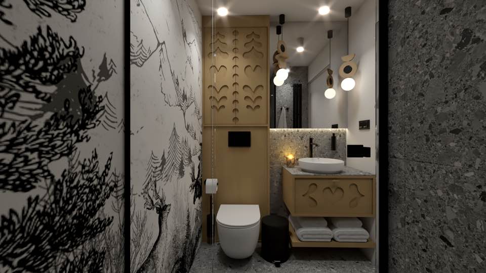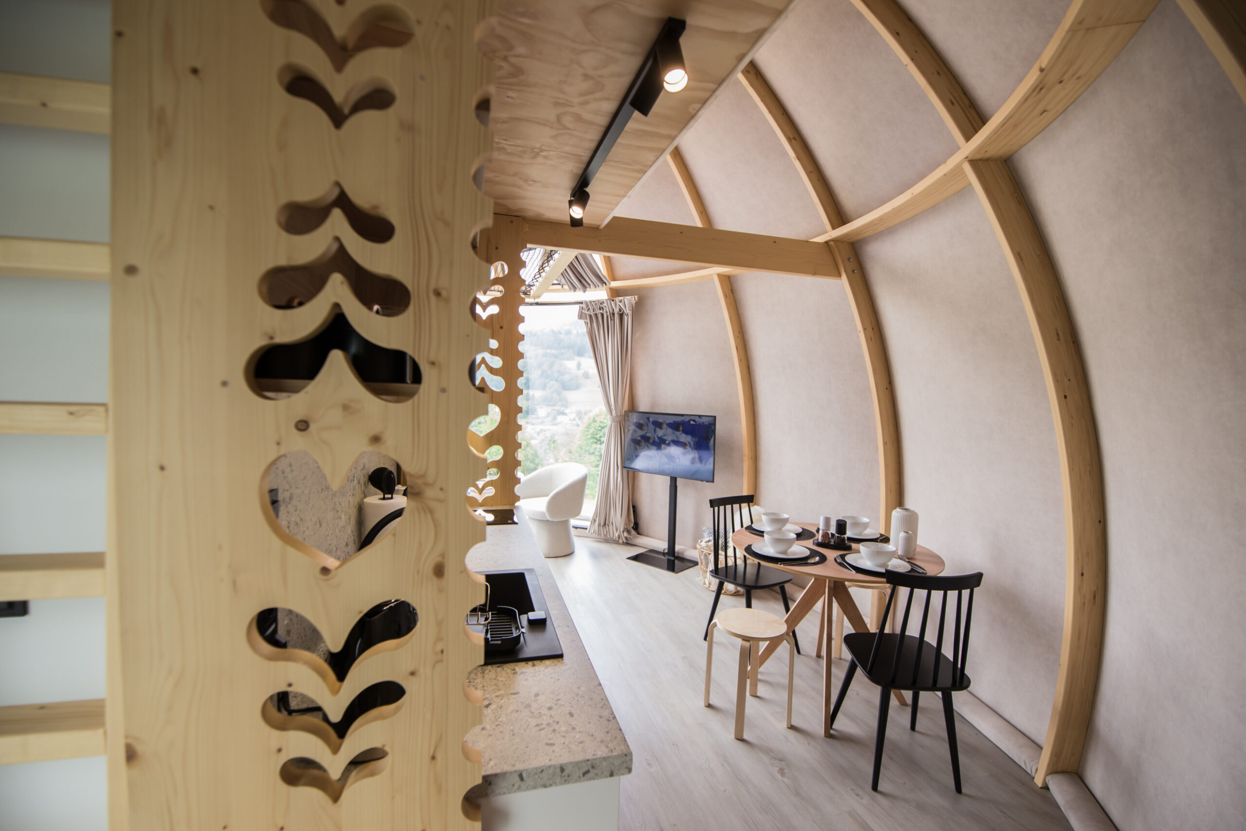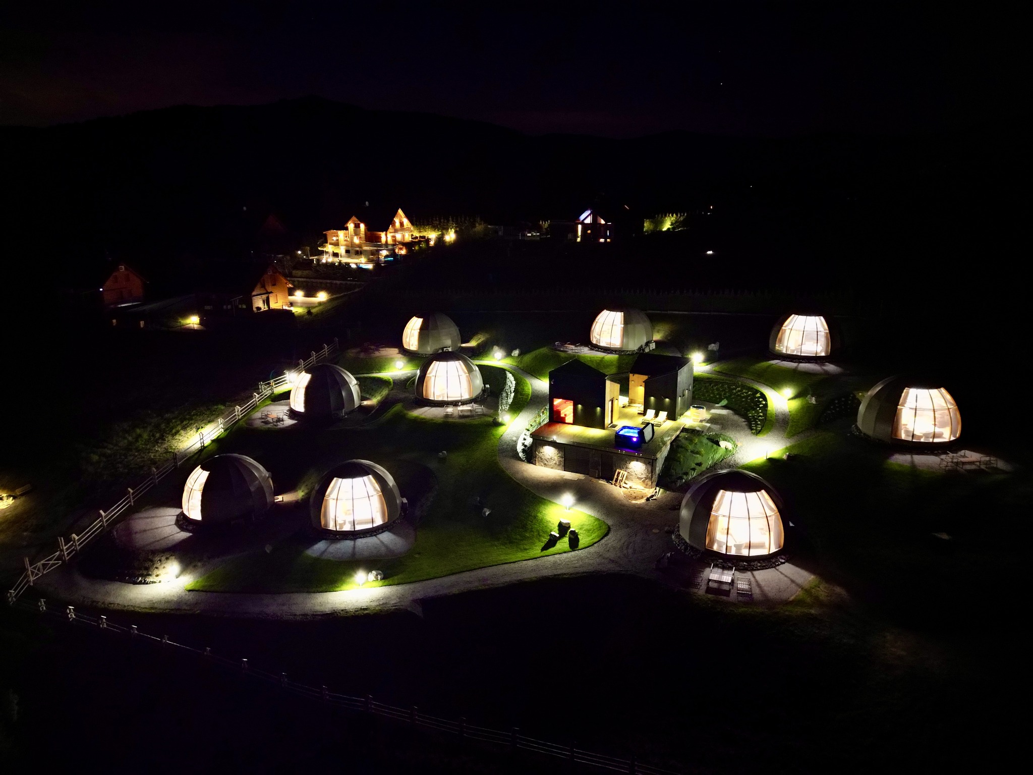 Nasze glampy zostały zaprojektowane i wybudowane z pasją i wielką dbałością o nawet najmniejsze detale. Wykonane zostały przez lokalne firmy oraz miejscowych rzemieślników. Funkcjonalnie glamp to luksusowy apartament z wygodnym podwójnym łóżkiem na parterze oraz dwoma pojedynczymi łóżkami na antresoli. Przestrzeń wewnątrz naszego glampa jest o wiele większa aniżeli w większości ekskluzywnych apartamentów. Zapewnia to kształt kuli potęgujący poczucie relaksu i komfortu. Wszystko to sprawia, że wypoczynek nabiera niepowtarzalnego charakteru. Do tego dochodzi zapierający dech widok przepięknej panoramy Beskidu Śląskiego, który podziwiać można na wiele sposobów: siedząc w glampie w wygodnym fotelu; pufie; wylegując się błogo w łóżku lub na hamaku/siatce, która znajduje się na antresoli. Możliwy jest także wypoczynek na swoim prywatnym tarasie przed glampem lub na leżaku w strefie wellness. W glampach znajduje się wygodny aneks kuchenny (lodówka, kuchenka mikrofalowa, płyta indukcyjna, dzbanek elektryczny), smart TV, system klimatyzacji i ogrzewania wraz z rekuperacją oraz komfortowa łazienka.