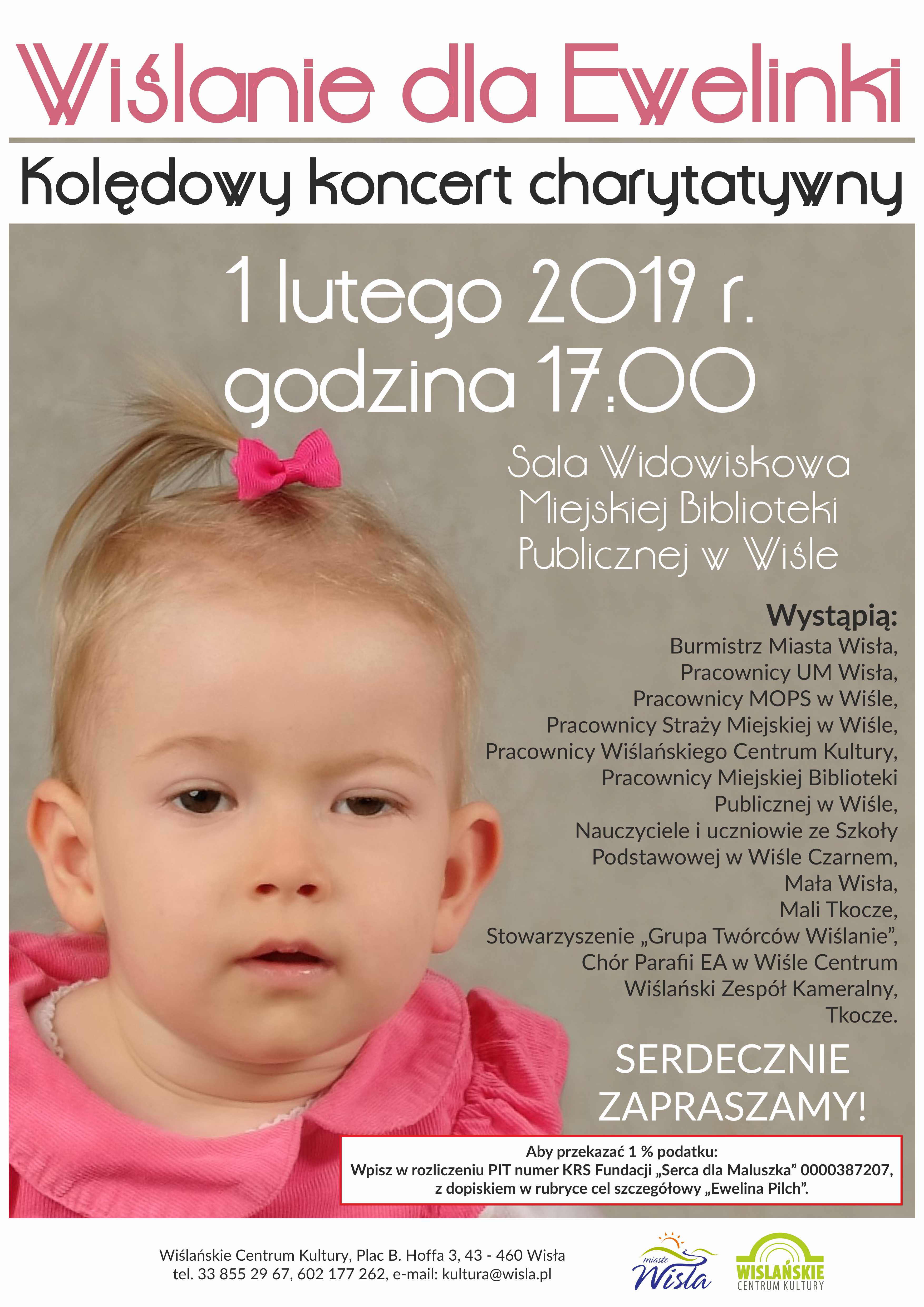 1 lutego 2019 r. o godzinie 17:00 w Sali widowiskowej Miejskiej Biblioteki Publicznej w Wiśle odbędzie się kolędowy koncert charytatywny "Wiślanie dla Ewelinki".