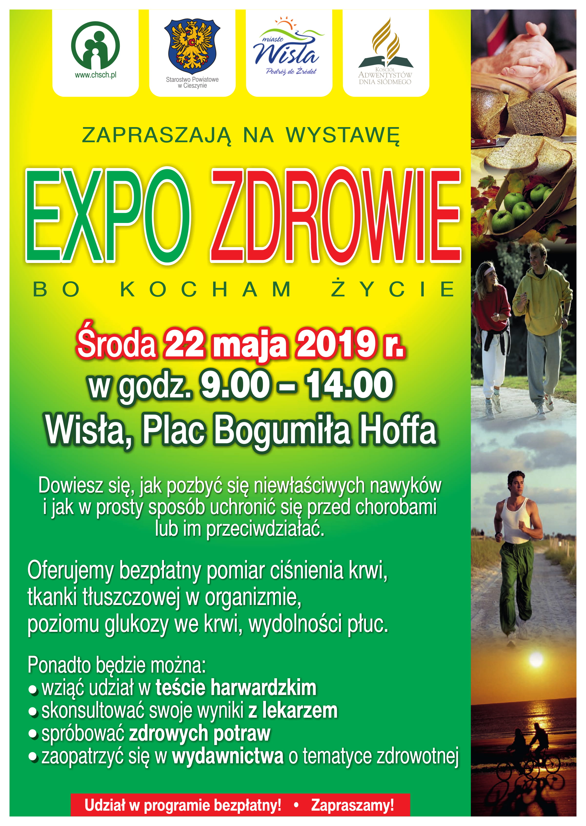 22 maja 2019 r. w godzinach 9.00 - 14.00 odbędzie się w Wiśle na Placu Bogumiła Hoffa kolejny Tydzień Zdrowia - Expo Zdrowie 2019. Organizatorem wystawy jest Chrześcijańska Służba Charytatywna Filia w Wiśle.