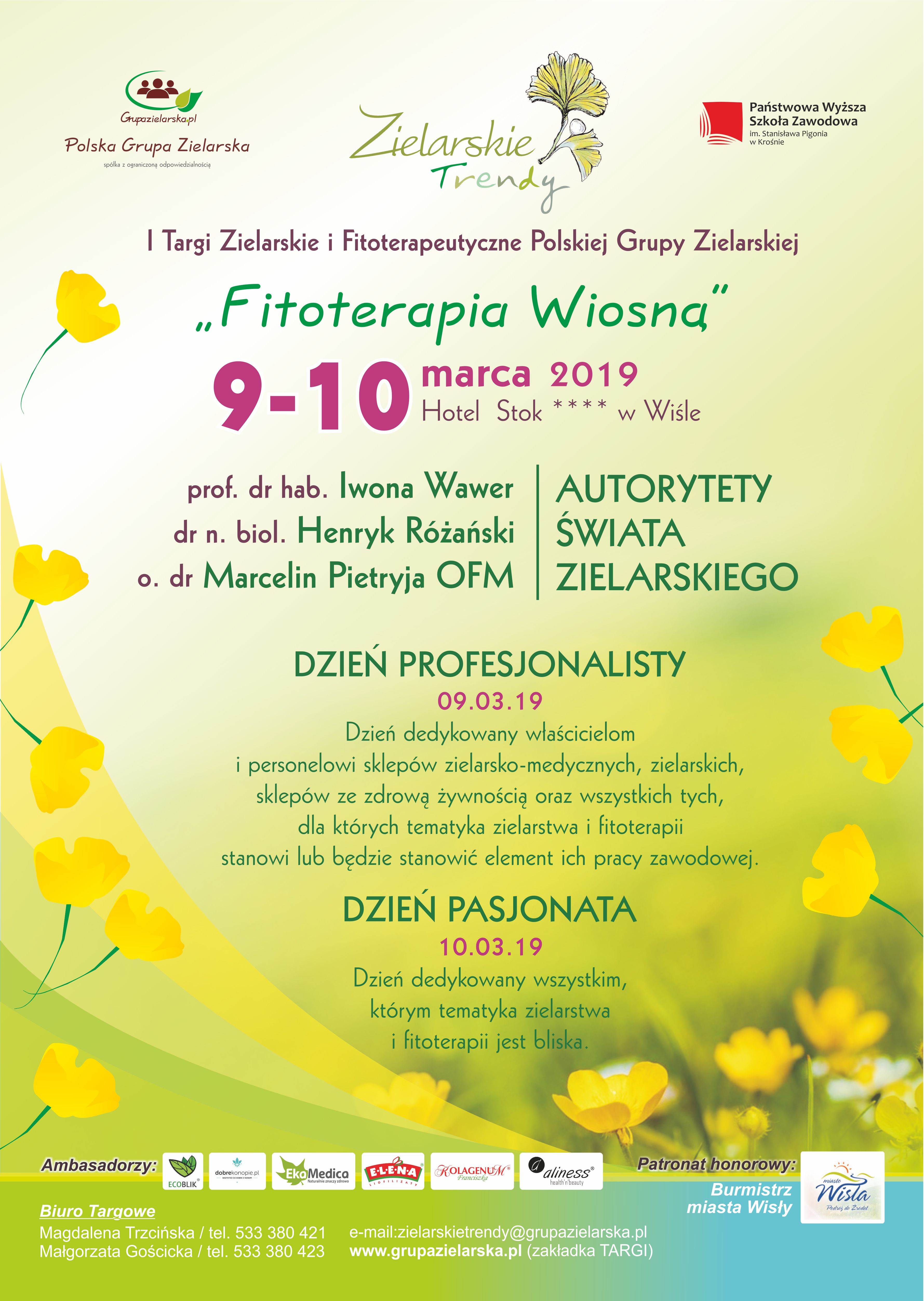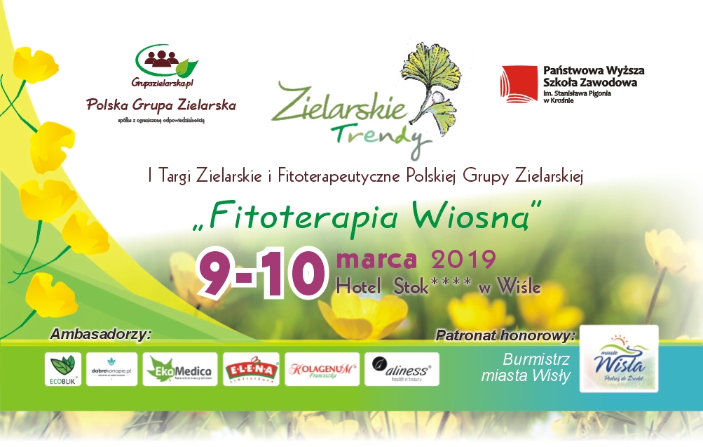 "Zielarskie Trendy", czyli I Targi Zielarskie i Fitoterapeutyczne Polskiej Grupy Zielarskiej, których hasłem przewodnim będzie „Fitoterapia Wiosną”. Targi organizowane są we współudziale z naszym partnerem – Państwową Wyższą Szkołą Zawodową im. Stanisława Pigonia w Krośnie. Na "Zielarskie Trendy" zapraszamy do malowniczego Hotelu Stok w Wiśle.