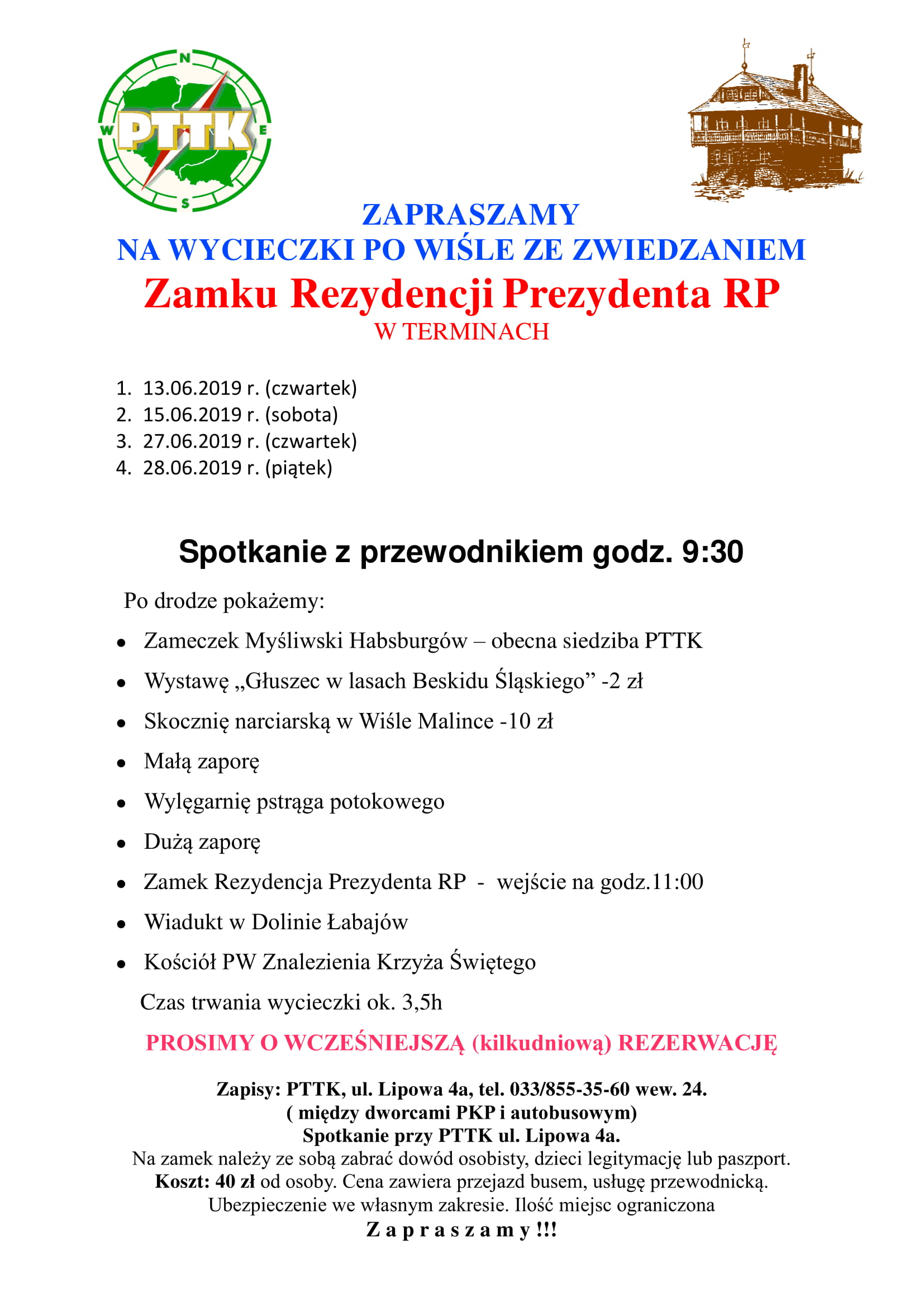 Zapisy: PTTK, ul. Lipowa 4a, tel. 33/855-35-60 wew. 24 (między dworcami PKP i autobusowym)