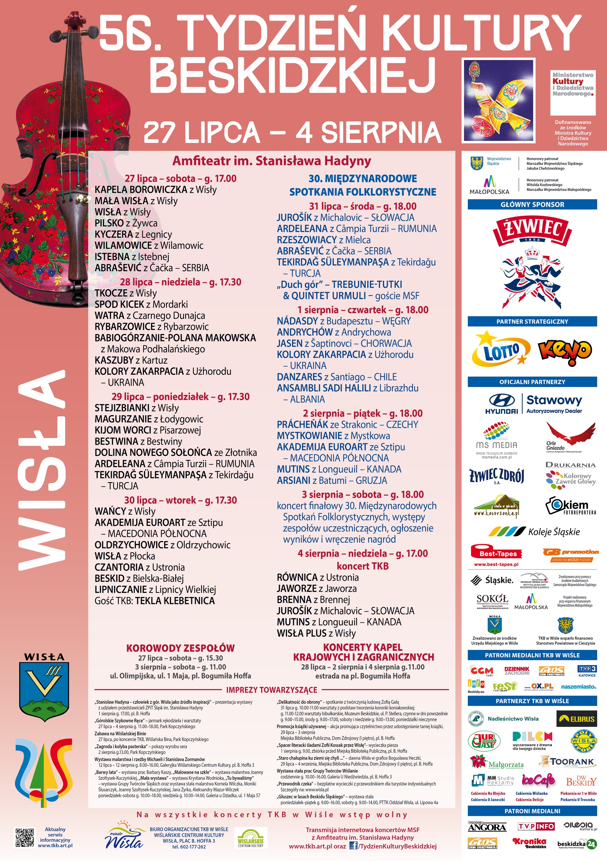 Tydzień Kultury Beskidzkiej czyli święto folkloru w Beskidach należy do największych i najbardziej znanych imprez folklorystycznych w Europie. Trwa dziewięć dni, które są wypełnione koncertami, wystawami, kiermaszami i spotkaniami z twórcami ludowymi. Wisła, Szczyrk, Żywiec, Maków Podhalański, Oświęcim – to tzw. Estrady TKB, czyli główne miejscowości, w których odbywa się impreza. Poza estradami głównymi wielką popularnością cieszą się też estrady towarzyszące tj. Festyn Istebniański, Wawrzyńcowe Hudy w Ujsołach oraz Gorolski Święto w Jabłonkowie.