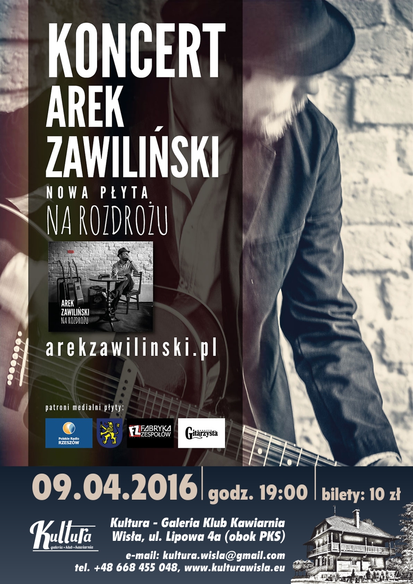 Kultura – Galeria Klub Kawiarnia zaprasza na koncert, na którym zagra AREK ZAWILIŃSKI. Koncert odbędzie się w sobotę 9 kwietnia 2016 r. o godz. 19:00 w Pałacyku Myśliwskim Habsburgów w Wiśle, ul. Lipowa 4a (obok PKS i PTTK).