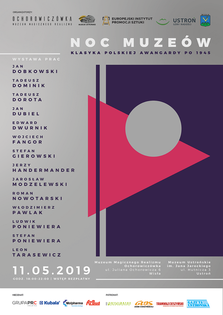 Już 11 maja zapraszamy wraz z miastem Ustroń na I Ustrońską Noc Muzeów. Z największą radością informujemy, że Muzeum Magicznego Realizmu Ochorowiczówką przygotowało dla naszych zwiedzających wspaniałą atrakcję – wystawę malarstwa KLASYKA POLSKIEJ AWANGARDY PO 1945 r. Ekspozycję będzie można obejrzeć tylko tego dnia w godz. 18:00 – 22:00. Uwaga: wystawa będzie podzielona. Część prac udostępnimy w Muzeum Ustrońskim, a część w Ochorowiczówce. Wstęp WOLNY! Aby ułatwić naszym Gościom zwiedzenie obu części ekspozcyji, w godz. od 18:00 do 21:30, zarówno pod Muzeum Ustrońskim, jak i pod Ochorowiczówką, czekać będzie na Państwa Ustrońska Ciuchcia, kursująca między muzeami. Tylko tego dnia cena promocyjna - 10 zł/os. Więcej szczegółów na www.muzeum.ustron.pl