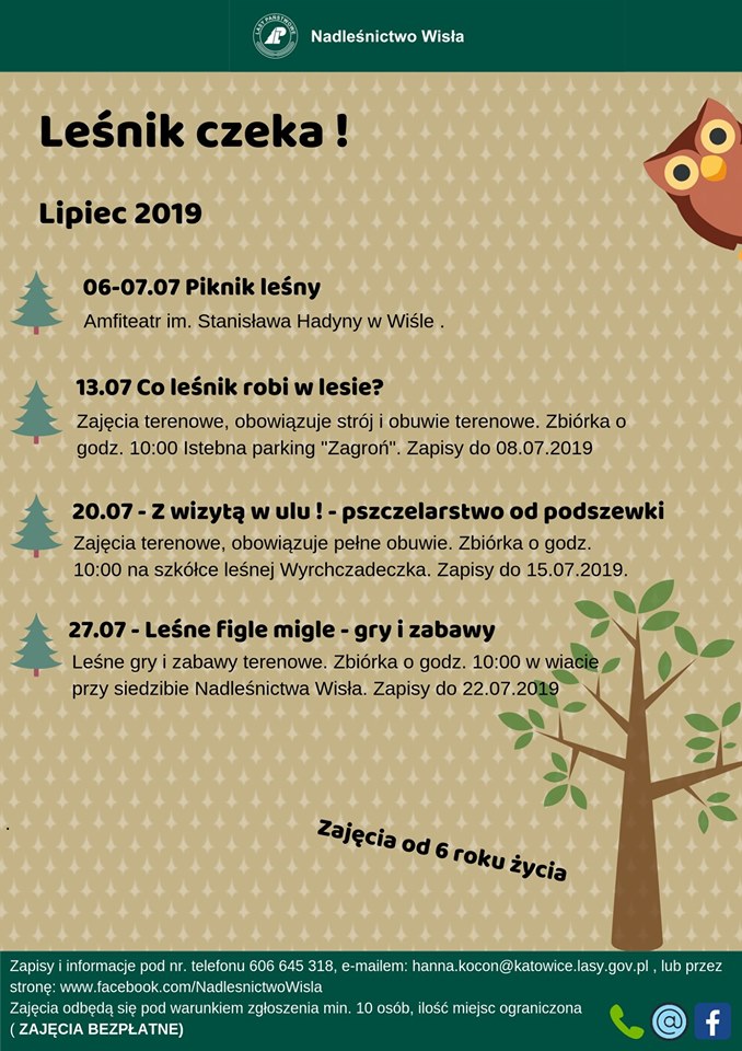 Zapisy i informacje pod nr. telefonu 606 645 318, e-mailem: hanna.kocon@katowice.lasy.gov.pl, lub przez stronę: www.facebook.com/NadlesnictwoWisla