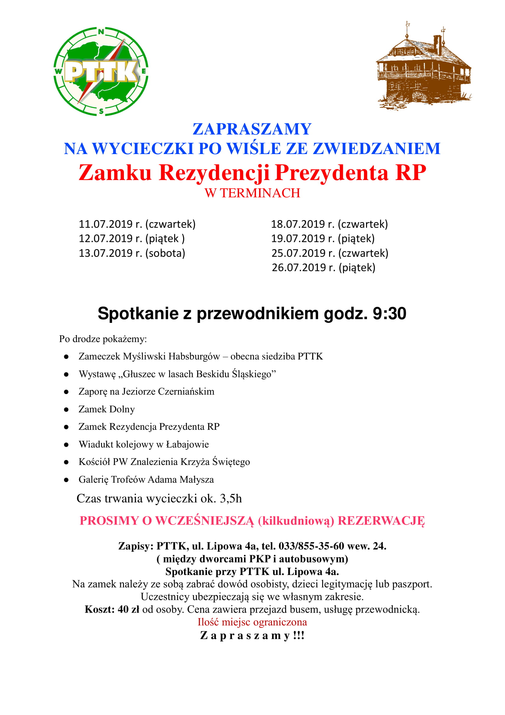 Zapisy: PTTK, ul. Lipowa 4a, tel. 33/855-35-60 wew. 24 (między dworcami PKP i autobusowym) Spotkanie z przewodnikiem przy PTTK ul. Lipowa 4a.