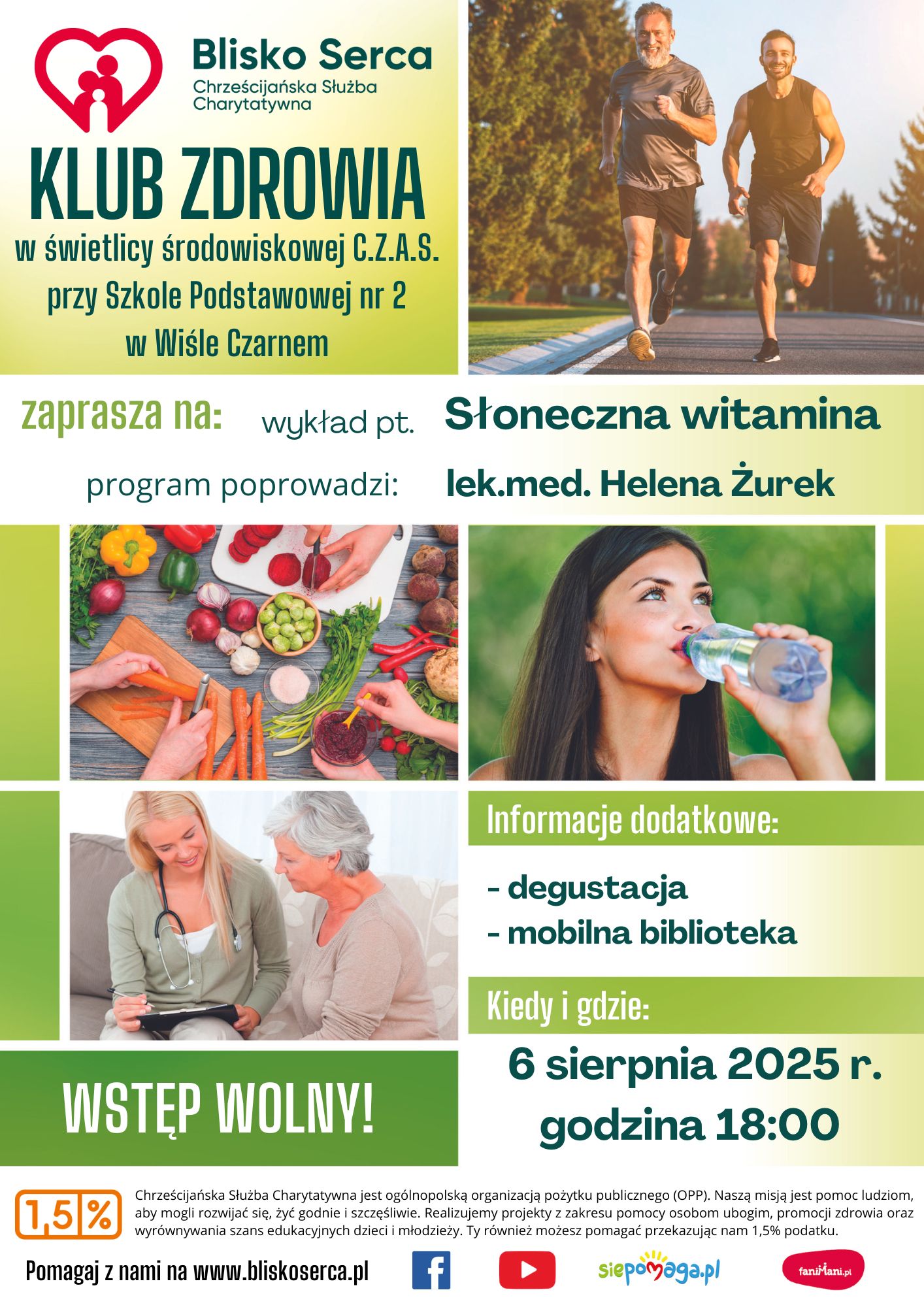 Chrześcijańska Służba Charytatywna Filia w Wiśle zaprasza na kolejne spotkanie w ramach Klubu Zdrowia, które odbędzie się we wtorek 6 sierpnia 2025 r. o godz. 18:00 w świetlicy środowiskowej przy Szkole Podstawowej nr 2 w Wiśle Czarnem.