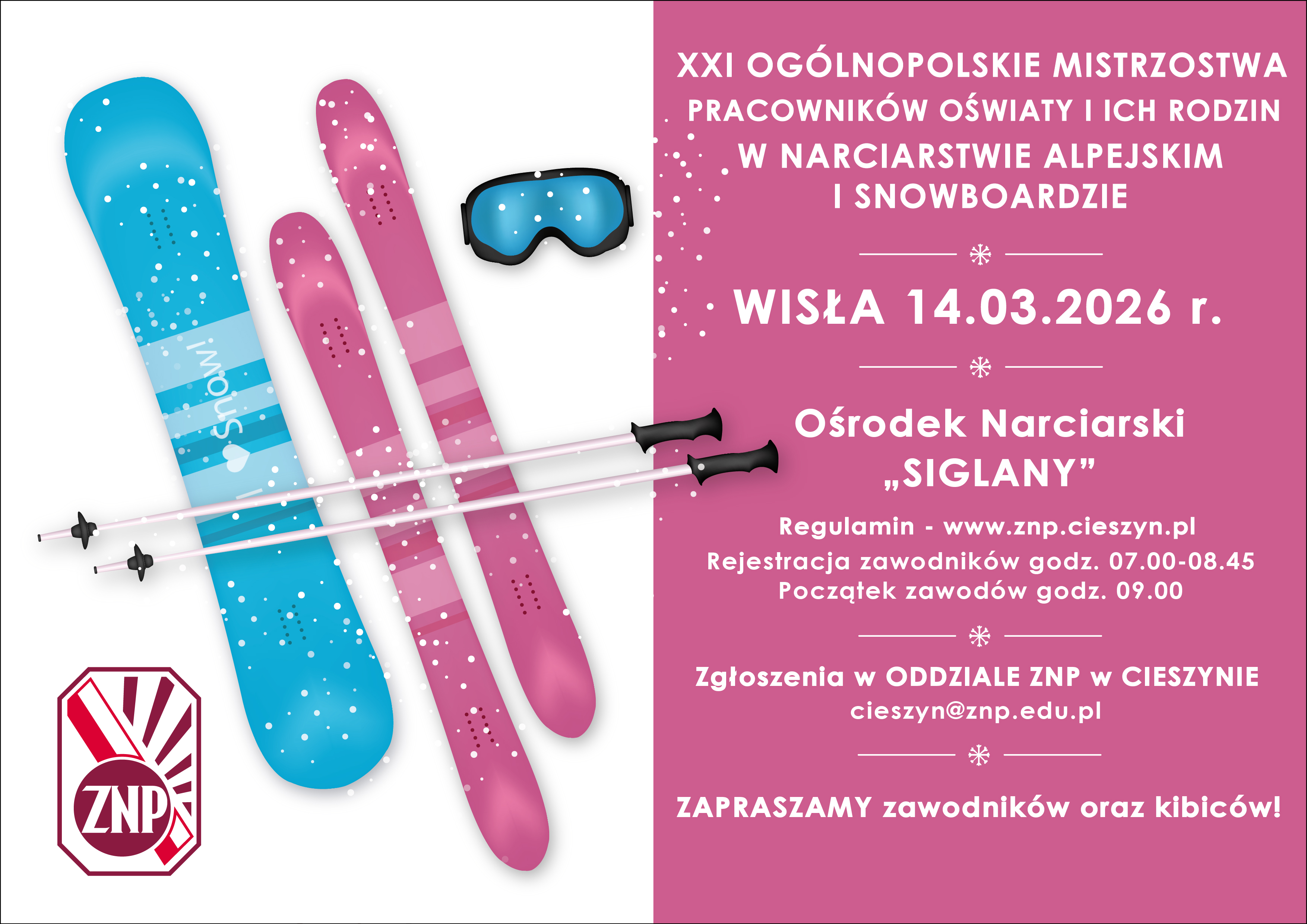 Związek Nauczycielstwa Polskiego Oddział w Cieszynie zaprasza do udziału w XXI Ogólnopolskich Mistrzostwach Pracowników Oświaty i Ich Rodzin w Narciarstwie Alpejskim i Snowboardzie.