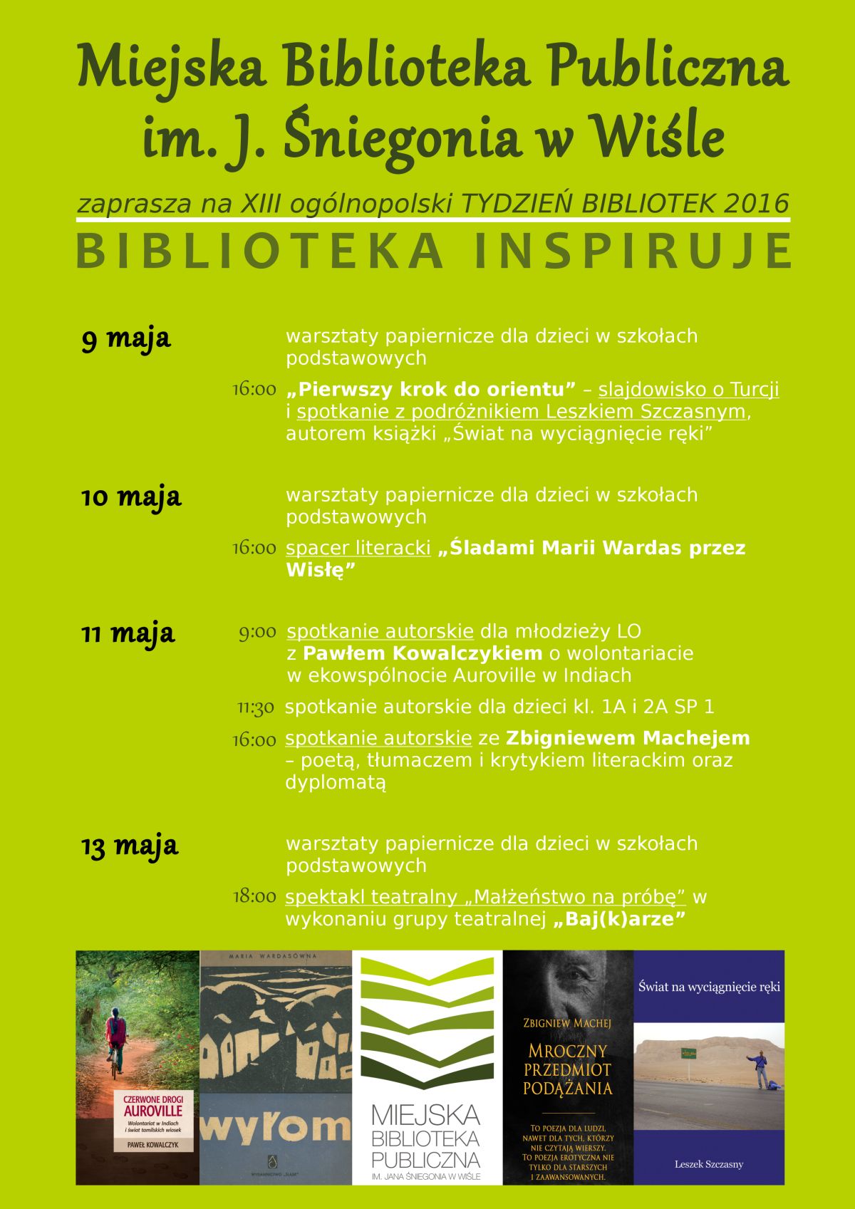 - godz. 9.00 spotkanie autorskie dla młodzieży LO z Pawłem Kowalczykiem o wolontariacie w ekowspólnocie Auroville w Indiach,