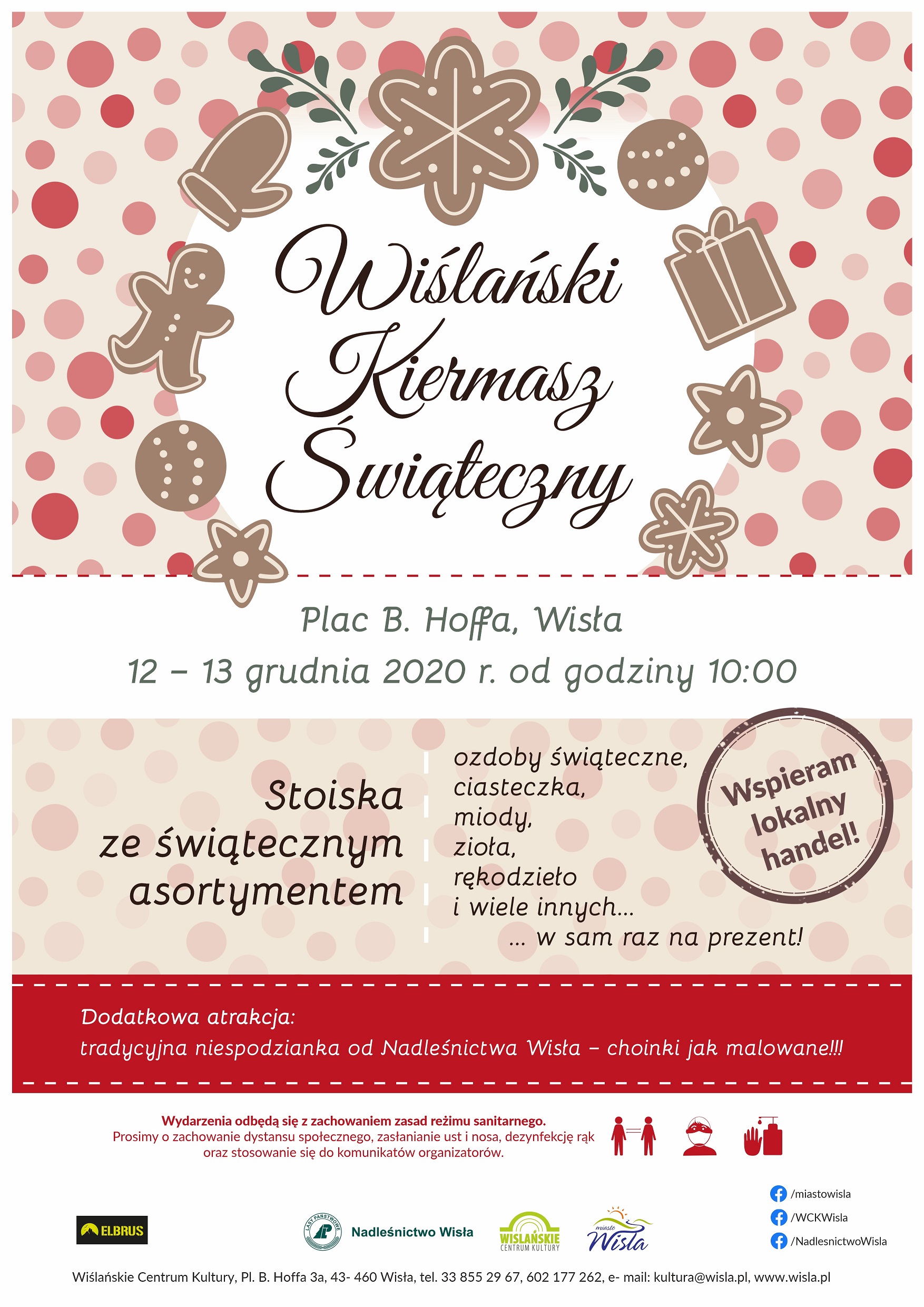 Zapraszamy na świąteczny kiermasz na wiślańskim rynku. Jarmark z Tradycją zamieniliśmy na świąteczny kiermasz. Ze względu na sytuację epidemiczną nie mogą odbyć się wysteoy artystyczne i inne planowane atrakcje ale czekać będzie na Państwa mnóstwo stoisk z ciekawymi artykułami. Będzie można zakupić ozdoby świąteczne, prezenty, różne smakołyki i piękne rękodzieło. Zachęcamy do wspierania rękodzielników i lokalnych sprzedawców w tym trudnym dla wszystkich czasie.