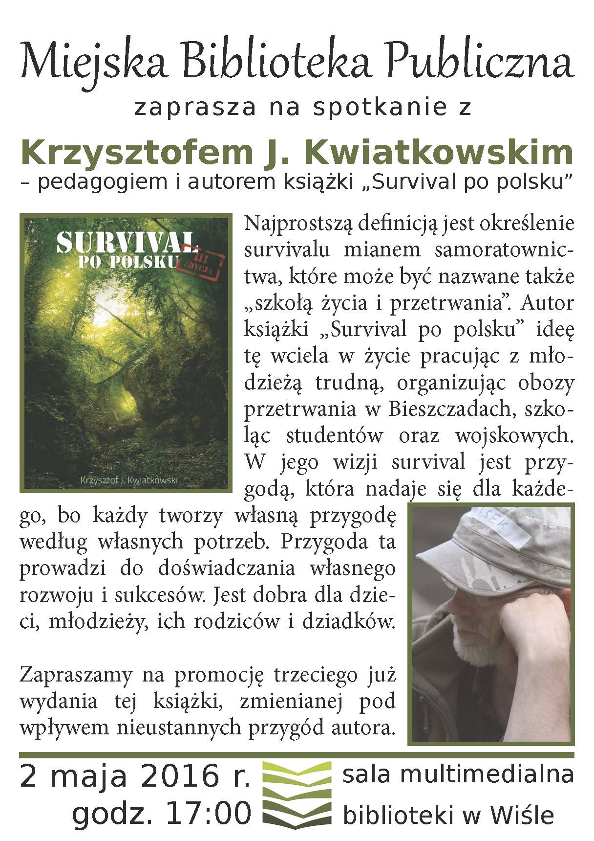Miejska Biblioteka Publiczna im. Jana Śniegonia w Wiśle serdecznie zaprasza na spotkanie z Krzysztofem J. Kwiatkowskim – pedagogiem i autorem książki „Survival po polsku”