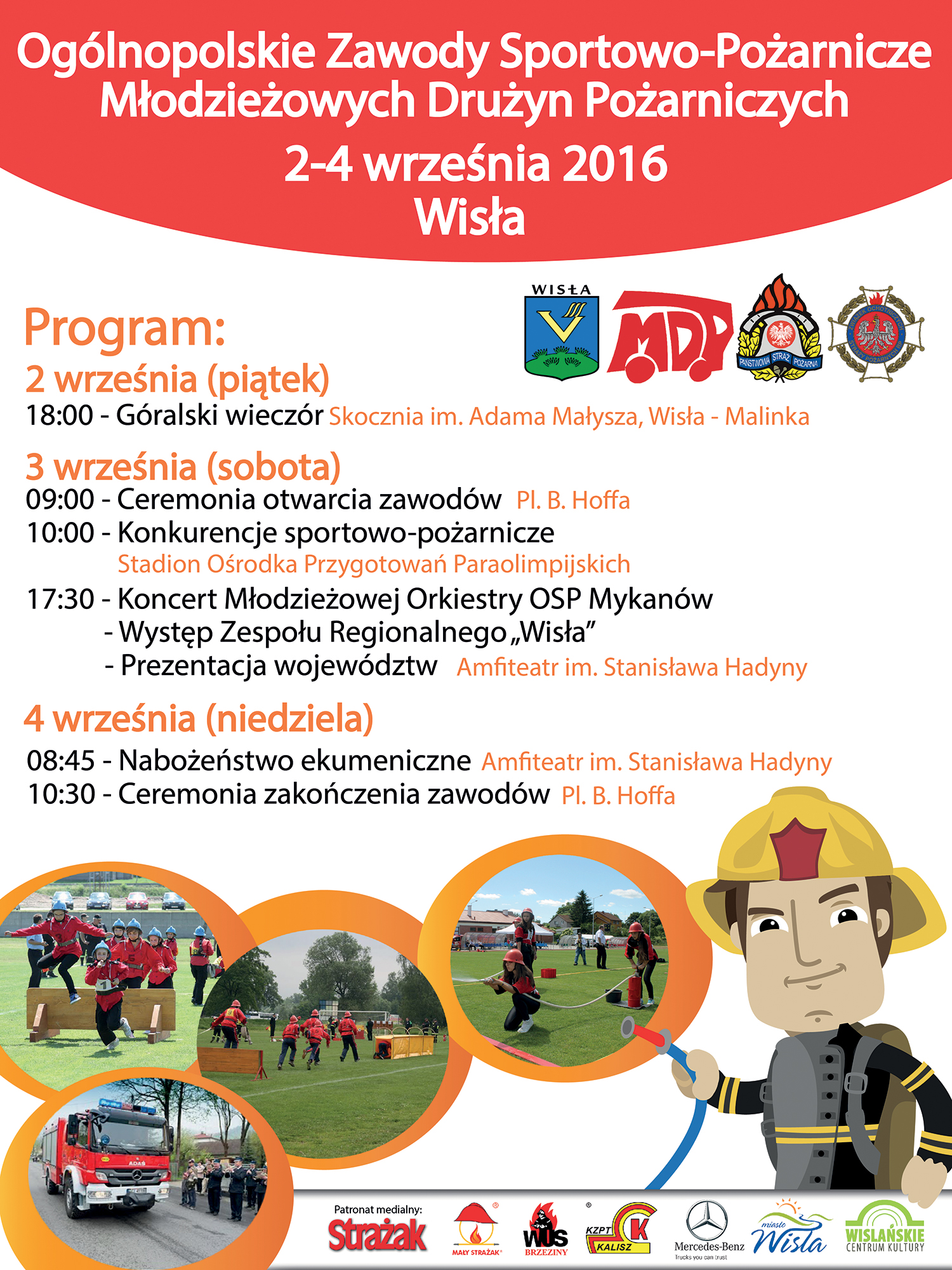 Główne zawody odbędą się 3 września. Po ceremonii otwarcia zawodów, którą zaplanowano na godz. 9:00 na placu Bogumiła Hoffa, uczestnicy zawodów przemaszerują na stadion przy ul. Olimpijskiej 1, gdzie o godz. 10:00 w pożarnicze szranki stanie kilkadziesiąt drużyn MDP. Emocji z pewnością nie zabraknie, gdyż przed młodymi druhami trudne i wymagające dużej sprawności, a dla kibiców efektowne konkurencje. Po zawodach, o godz. 17:30, w Amfiteatrze im. Stanisława Hadyny odbędzie się koncert orkiestry dętej OSP oraz prezentacja województw. Całe wydarzenie zakończy się 4 września. Tego dnia o 8:45 druhowie spotkają się na nabożeństwie ekumenicznym, które zostanie odprawione w amfiteatrze, a następnie drużyny przejdą na plac Hoffa, gdzie o godz. 10:30 odbędzie się ceremonia zakończenia zawodów.