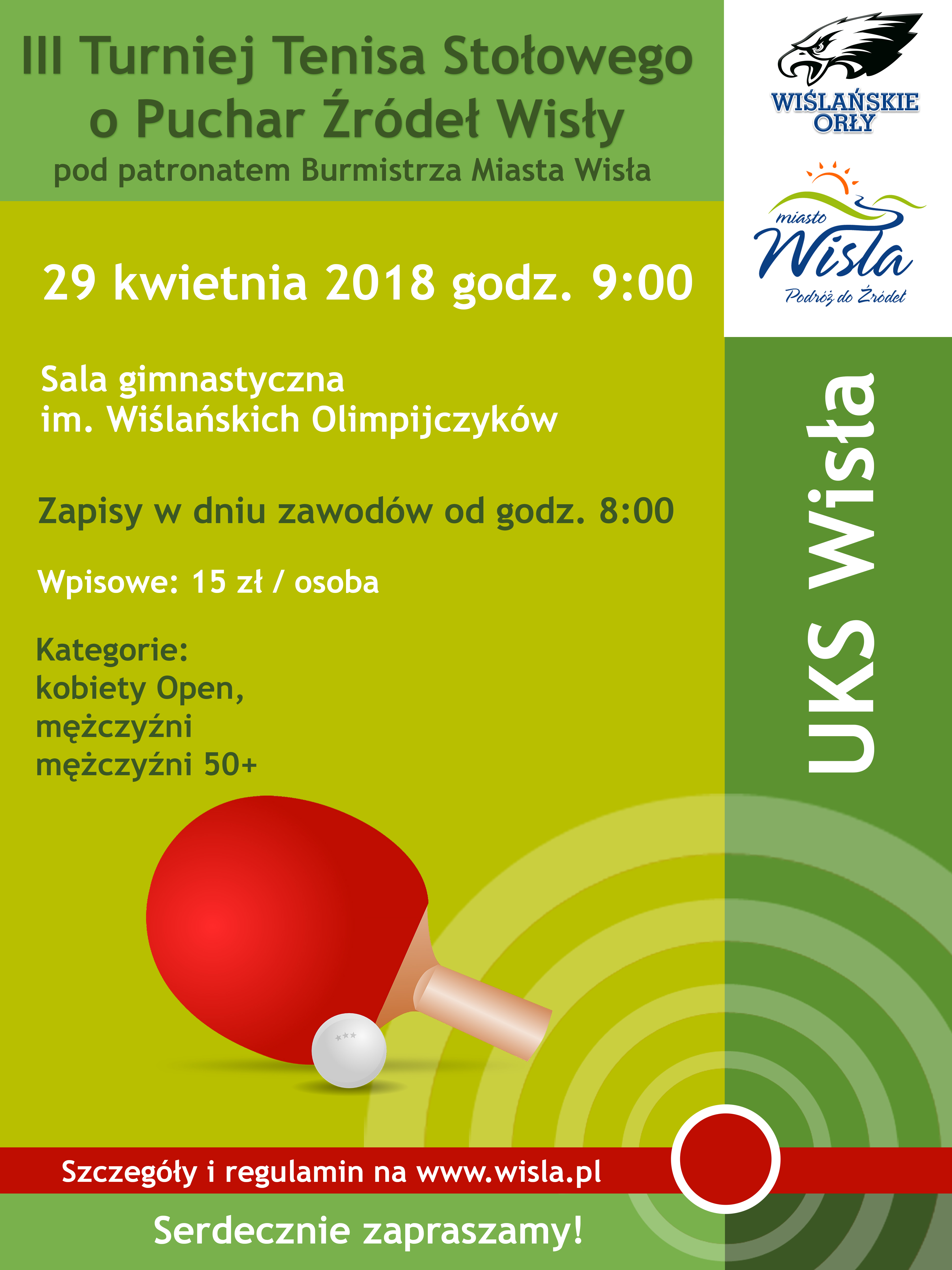 29 kwietnia wszystkich miłośników tenisa stołowego zapraszamy na III Turniej o Puchar Źródeł Wisły. W turnieju może wziąć udział każdy, kto skończył 16 lat oraz spełnia warunki regulaminowe (do pobrania poniżej).