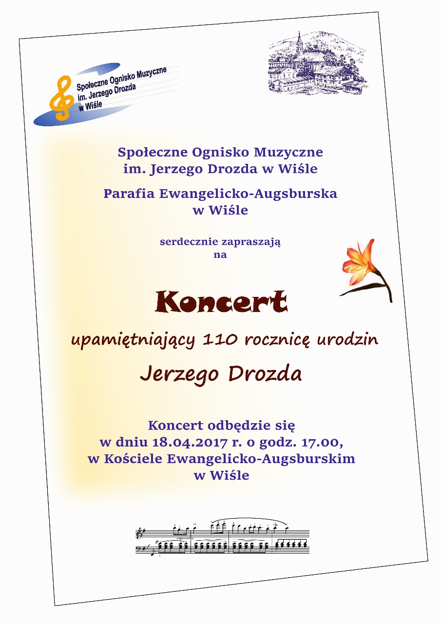 Społeczne Ognisko Muzyczne im. Jerzego Drozda i Parafia Ewangelicko-Augsburska w Wiśle serdecznie zapraszają na koncert upamiętniający 110. rocznicę Jerzego Drozda.