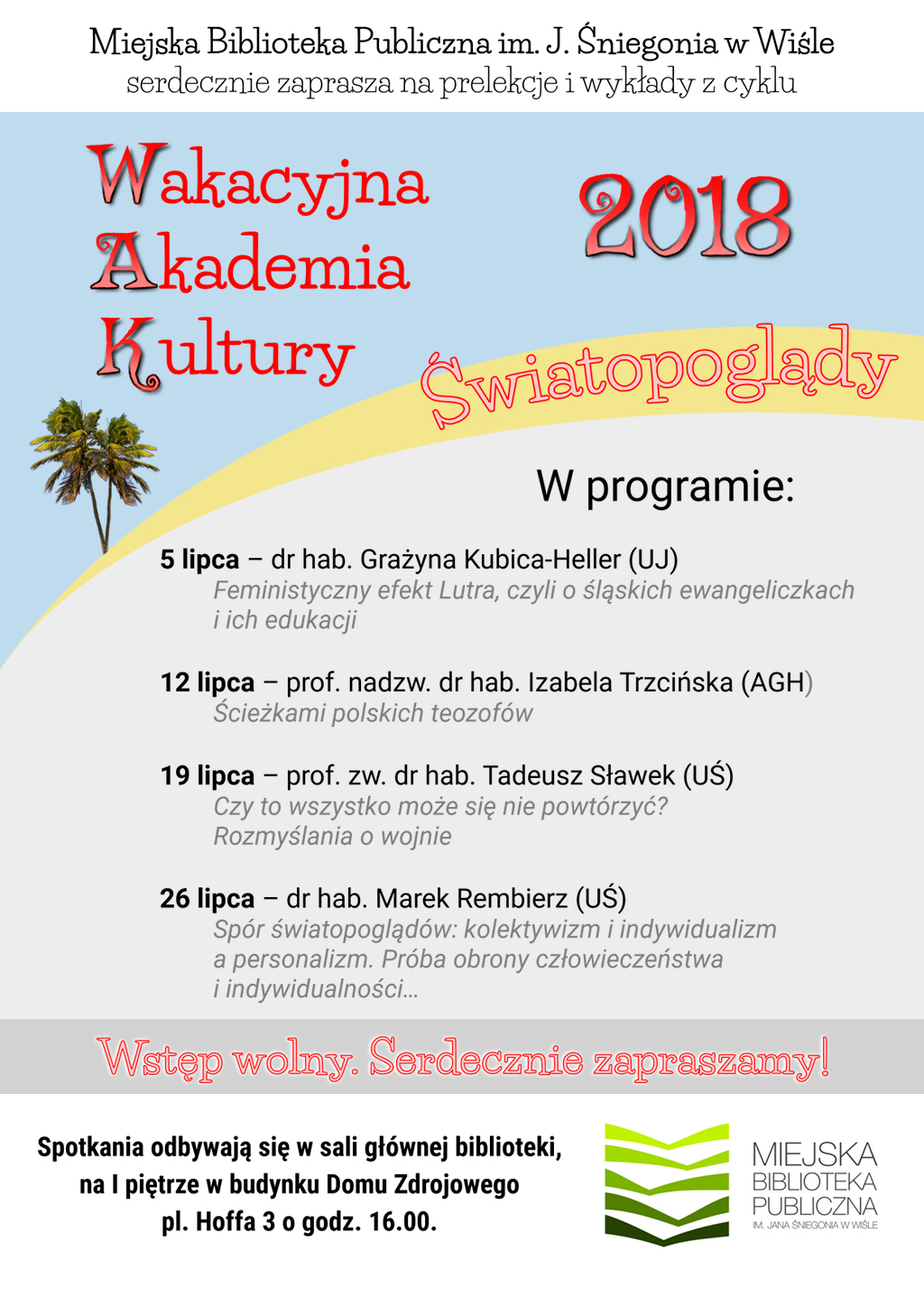 Miejska Biblioteka Publiczna im. J. Śniegonia w Wiśle serdecznie zaprasza na prelekcje i wykłady z cyklu WAKACYJNA AKADEMIA KULTURY 2018 - Światopoglądy.