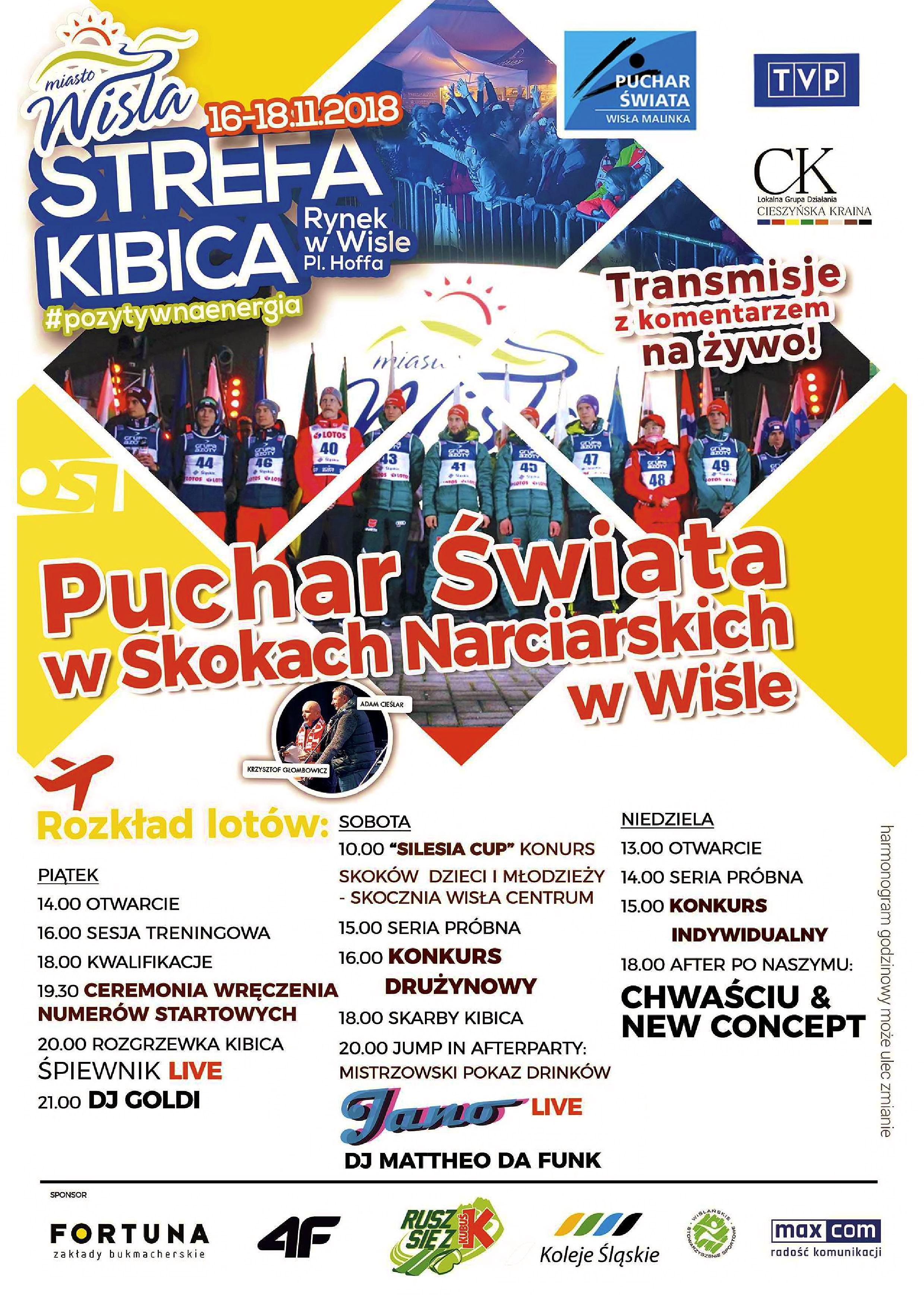 W dniach 16-18 listopada 2018 r. zapraszamy do Wisły na wielkie emocje sportowe. Tych kibiców, dla których zabrakło biletów, zapraszamy do Strefy Kibica na wspólne oglądanie transmisji z zawodów, oraz zabawę przy muzyce i nie tylko...