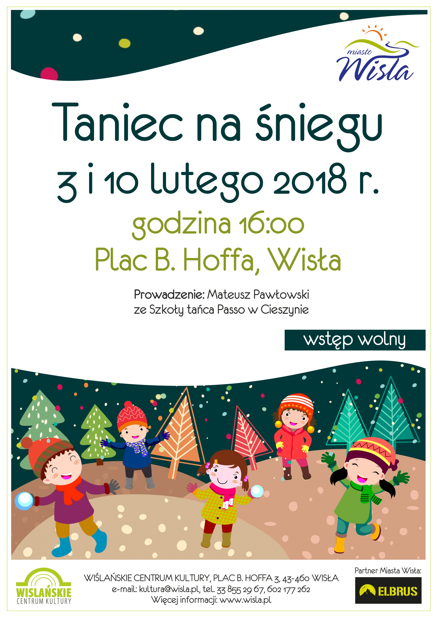 W dniach 3 oraz 10 lutego o godzinie 16:00 zapraszamy na Plac B. Hoffa, gdzie odbędzie się nauka tańca na śniegu. Zabawę poprowadzi Mateusz Pawłowski ze Szkoły tańca Passo w Cieszynie. Wstęp wolny.