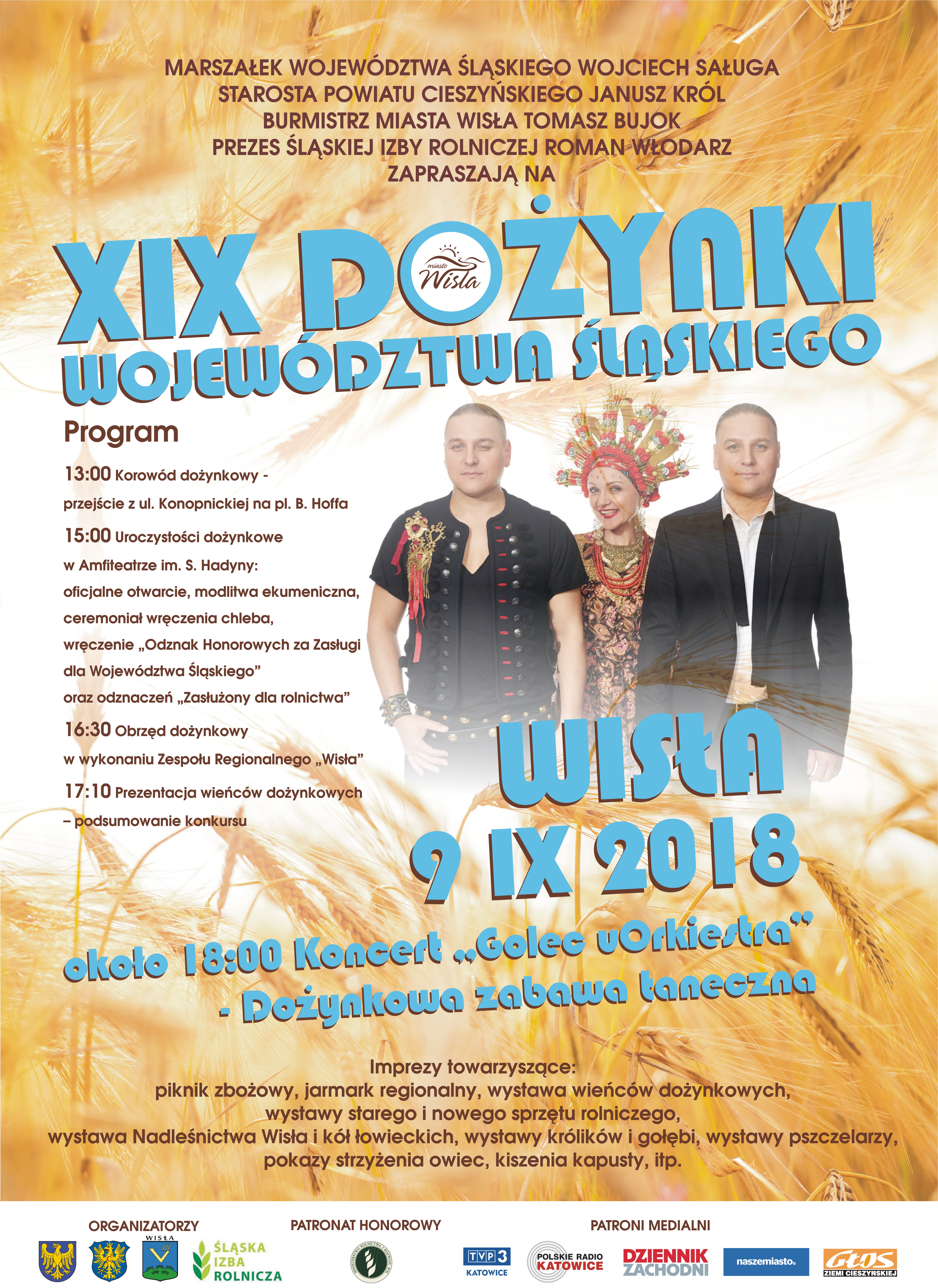 O godz. 15:00, już na deskach wiślańskiego Amfiteatru rozpoczną się uroczystości dożynkowe z oficjalnym otwarciem, modlitwą ekumeniczną i ceremoniałem wręczenia chleba. Będzie to również okazja do wyróżnienia zasłużonych osób, którym wręczone zostaną Odznaki Honorowe za Zasługi dla Województwa Śląskiego oraz odznaczenia Zasłużony dla Rolnictwa. O godz. 16:30 zobaczymy obrzęd dożynkowy w wykonaniu Zespołu Regionalnego „Wisła”, a o 17:10 prezentację wieńców dożynkowych. Około godz. 18:00 na scenę wejdzie gwiazda wieczoru, zespół „Golec uOrkiestra”. Po koncercie odbędzie się dożynkowa zabawa taneczna. Imprezie towarzyszyć będą: piknik zbożowy, jarmark regionalny, wystawa wieńców dożynkowych, wystawy starego i nowego sprzętu rolniczego, wystawa Nadleśnictwa Wisła i kół łowieckich, wystawa królików i gołębi, wystawy pszczelarzy, pokazy strzyżenia owiec i kiszenia kapusty, oraz wiele innych atrakcji. Wstęp jest wolny.
