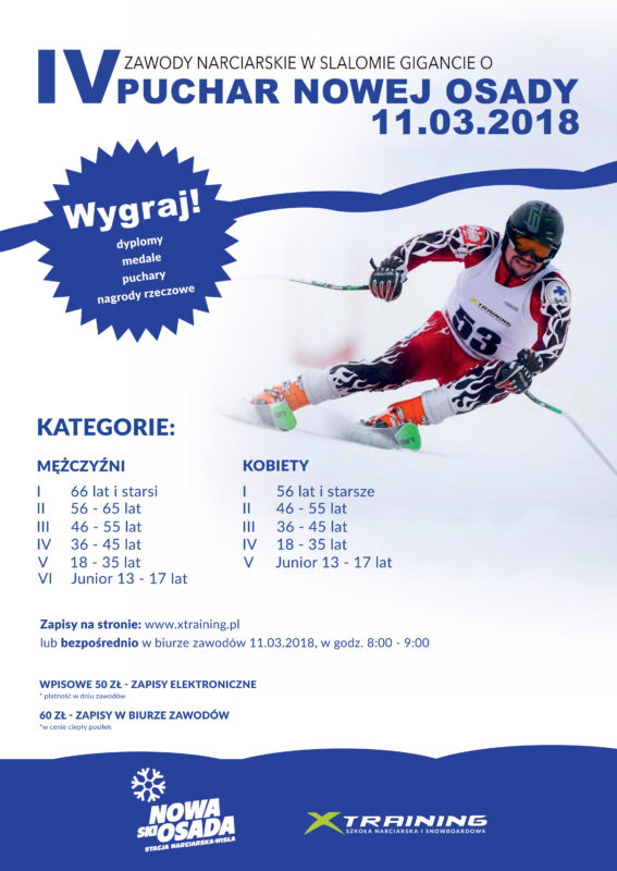 Już 11 marca odbędą się IV Zawody Narciarskie w Slalomie Gigancie o Puchar Nowej Osady. Planujemy kategorie wiekowe dla uczestników od 13 roku życia, bez górnej granicy. Osobno dla kobiet i mężczyzn. Zapisy na stronie www.xtraining.pl lub bezpośrednio w biurze zawodów, w dniu zawodów, w godzinach 8:00-9:00. Wpisowe płatne elektronicznie: 50 zł, płatne w dniu zawodów: 60 zł. W cenie posiłek dla zawodników.