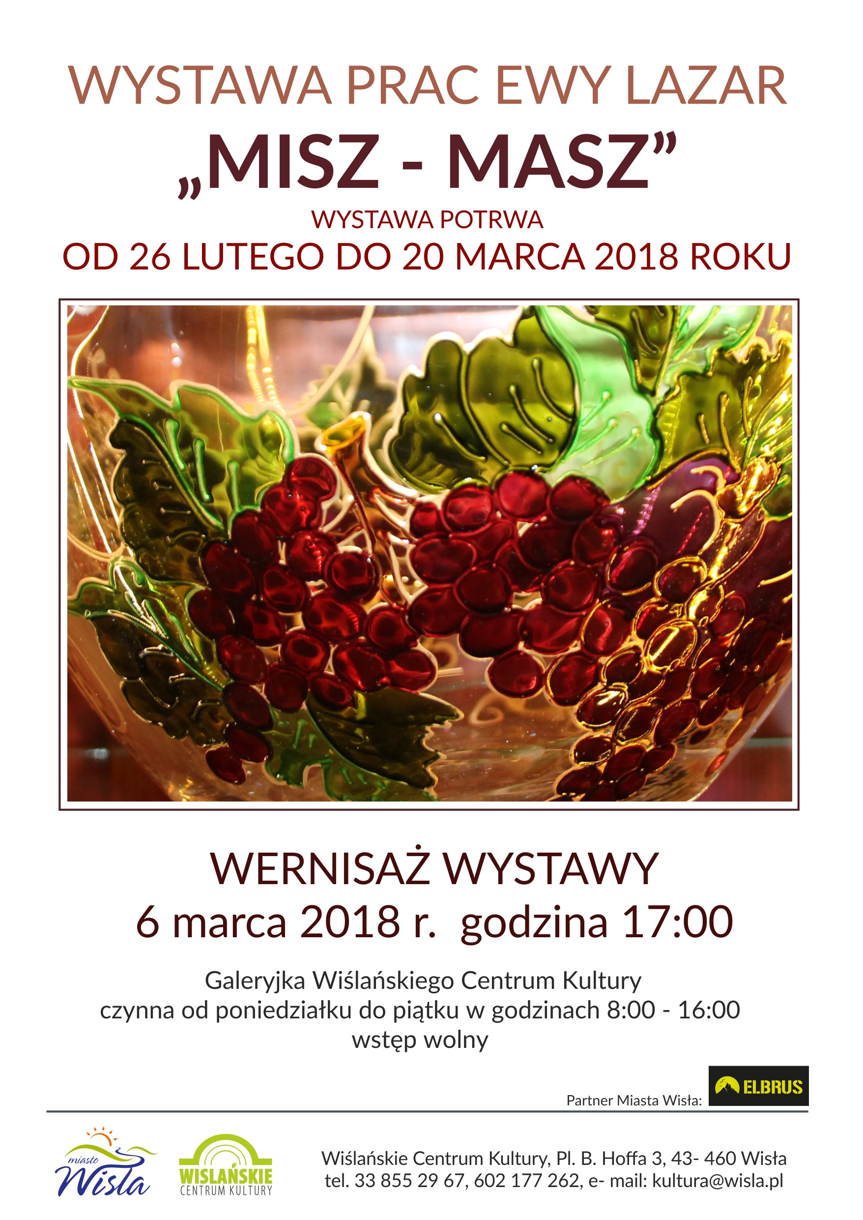 W dniach od 26 lutego do 20 marca 2018 r. w Galeryjce Wiślańskiego Centrum Kultury oglądać można wystawę prac Ewy Lazar pt. „Misz- Masz”. Uroczysty wernisaż z udziałem Artystki odbędzie się 6 marca 2018 r. o godzinie 17:00. Wstęp wolny. Serdecznie zapraszamy!