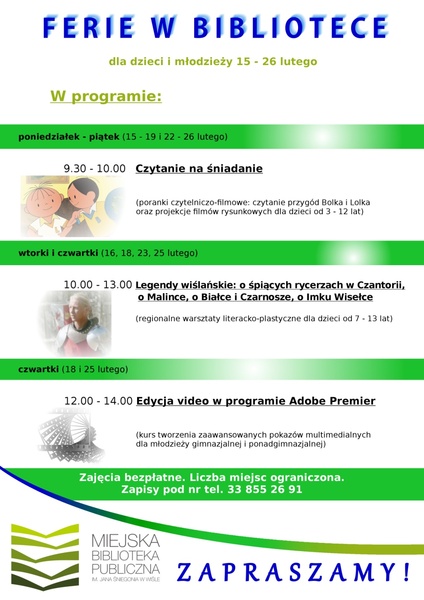 Miejska Biblioteka Publiczna im. Jana Śniegonia zaprasza dzieci i młodzież na "Ferie w bibliotece", które odbędą się w dniach 15-26 lutego.