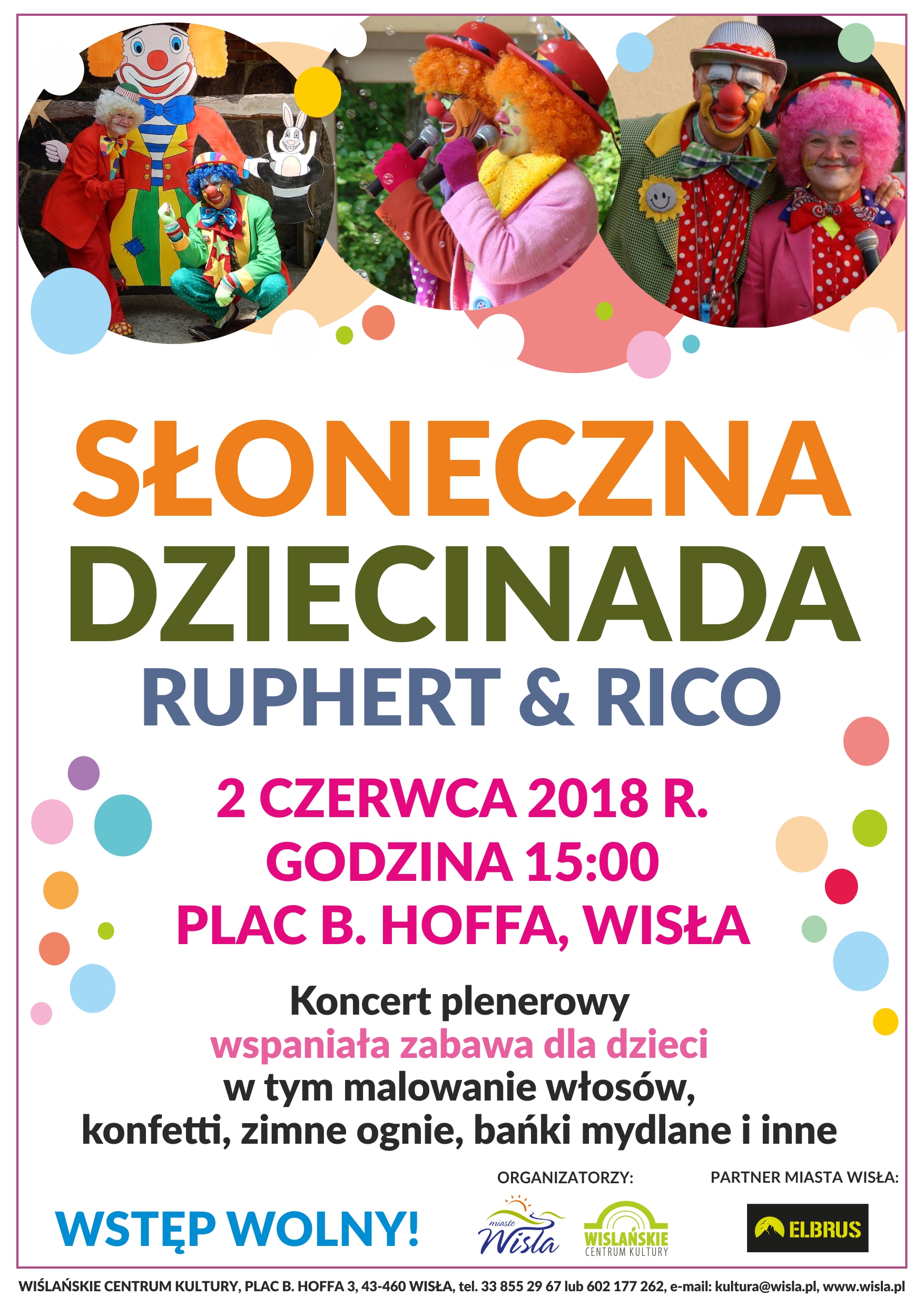 2 czerwca o godzinie 15:00 zapraszamy wszystkie dzieci do wspólnej zabawy na Placu B. Hoffa w Wiśle! Program "Słoneczna Dziecinada" Ruphert & Rico to doskonała zabawa dla najmłodszych. W programie: malowanie włosów, konfetti, zimne ognie, bańki mydlane i wiele innych. Wstęp wolny. Serdecznie zapraszamy!