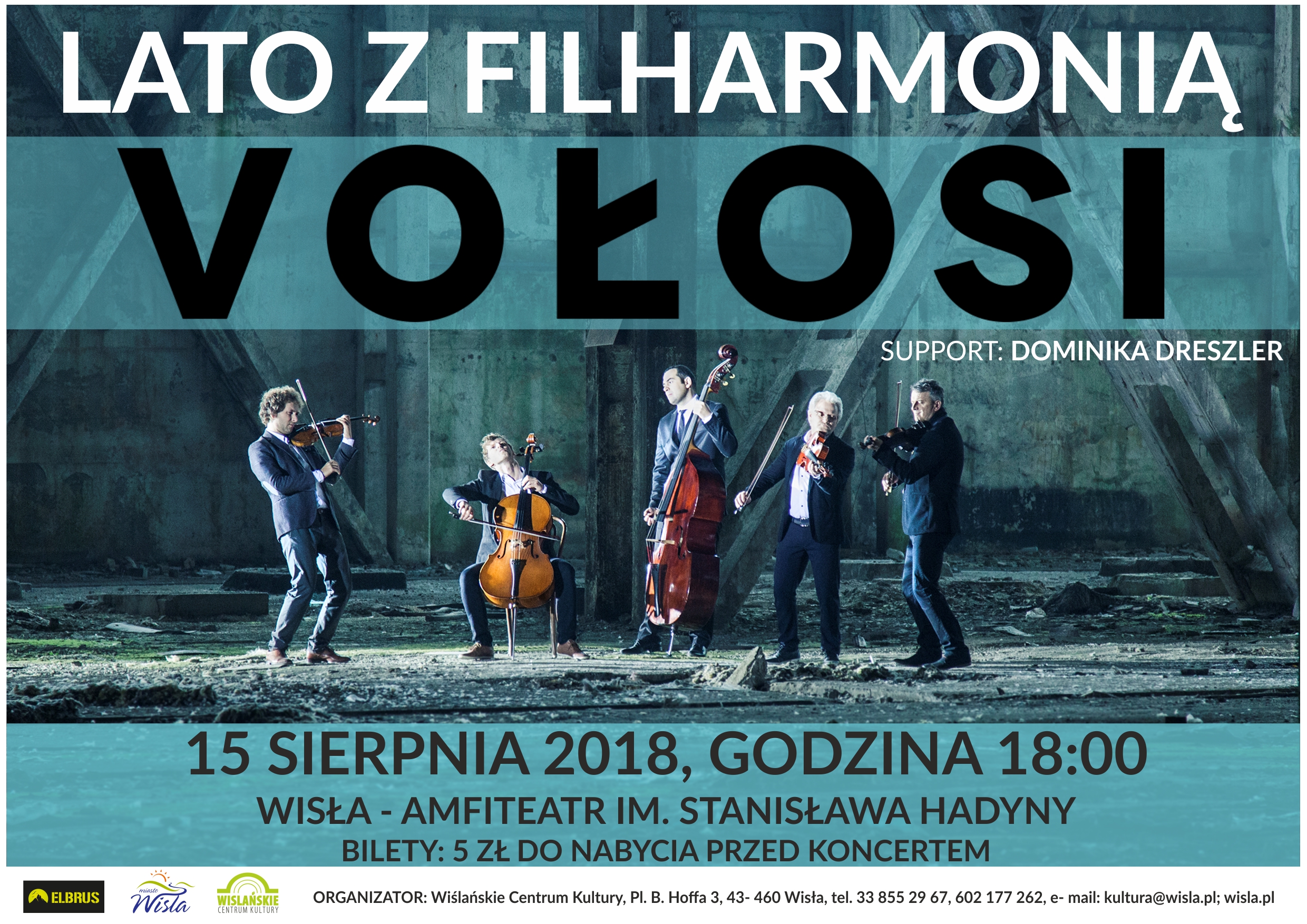 15 sierpnia 2018 r. o godzinie 18:00 w Amfiteatrze im. Stanisława Hadyny odbędzie się koncert z cyklu "Lato z Filharmonią'. Gwiazdą tegorocznego wydarzenia będzie zespół Vołosi. Jako support wystąpi Dominika Dreszler. Wstęp 5 zł. Bilety do nabycia przed koncertem. Serdecznie zapraszamy!