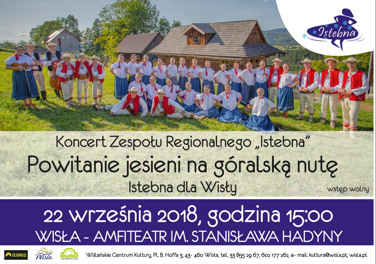 22 września o godzinie 15:00 w Amfiteatrze im. Stanisława Hadyny odbędzie się koncert Zespołu Regionalnego Istebna pt. "Powitanie jesieni na góralską nutę - Istebna dla Wisły".