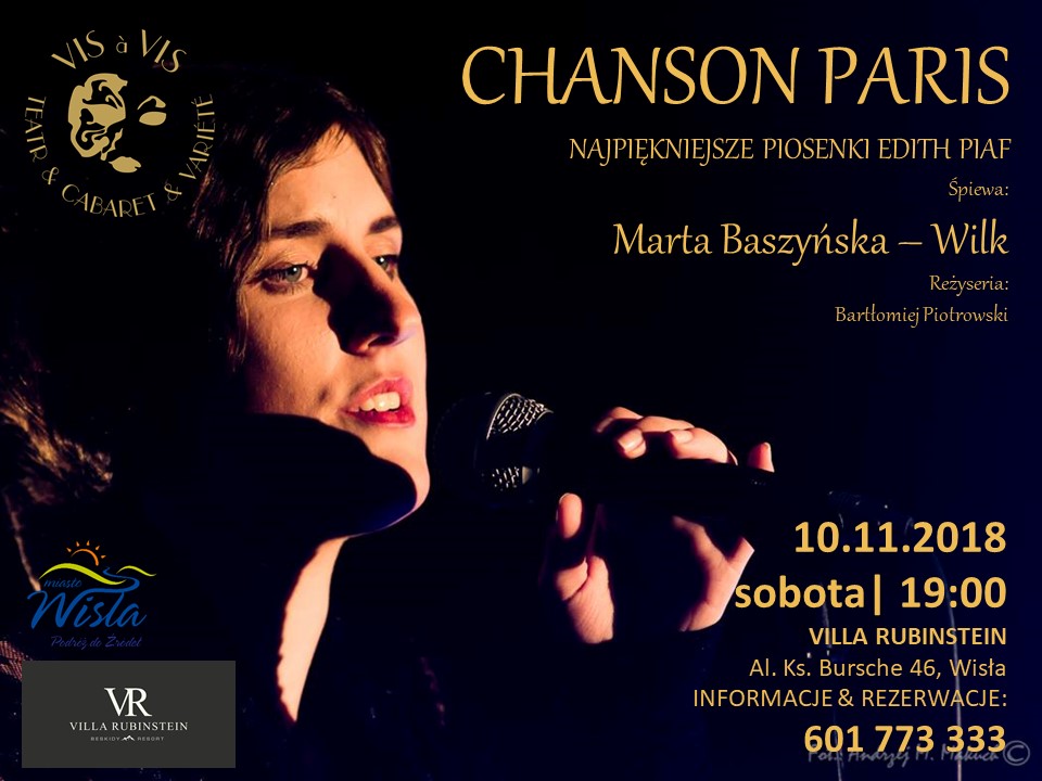 W wyjątkowym programie „CHANSON PARIS” - najpiękniejsze piosenki Edith Piaf, francuskie szlagiery oraz przeboje Ewy Demarczyk, a także wiersze Jacquesa Preverta i Haliny Poświatowskiej - zaśpiewa dla Państwa Marta Baszyńska - Wilk – aktorka scen muzycznych i wokalistka.