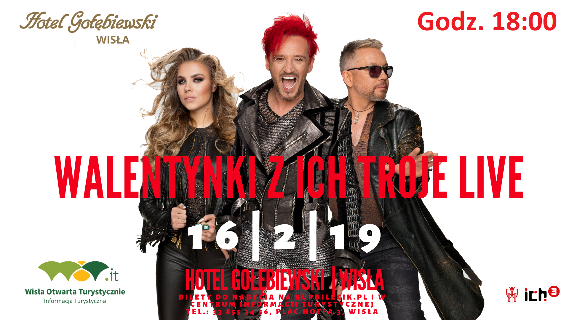 Ich Troje znów w Wiśle! Po niesamowitym koncercie w lutym 2018 roku, zespół znowu zagości w Hotelu Gołębiewskim! Ich Troje nikomu przedstawiać nie trzeba, wystarczy wspomnieć rok 2001 i Festiwal Polskiej Piosenki w Opolu. To właśnie tam roku zespół niemal zaczarował publiczność niezwykle barwnym wykonaniem utworu "Powiedz", które rozpoczęło prawdziwy boom i przyniosło grupie ogólnopolski rozgłos i uwielbienie rzeszy fanów. Zespół przez lata zagrał kilkaset koncertów w kraju i za granicą, sprzedał blisko 12 milionów płyt, a Michał Wiśniewski skutecznie dbał o to, aby koncerty zespołu nie były zwyczajne - na scenie pojawiał się balet, huśtawki, motocykle, a kiedy trzeba było - nawet zaplanowany deszcz! Takie show sprawiało, że publiczność od początku do końca oglądała występ z ogromnym zaciekawieniem. Podczas koncertu, granego pod hasłem "Walentynki z Ich Troje", usłyszymy największe hity zespołu takie jak "A wszystko to...", "Zawsze z Tobą chciałbym być", "Wypijmy za to!", "Babski świat", czy wspomniane "Powiedz", a także wiele, wiele innych.