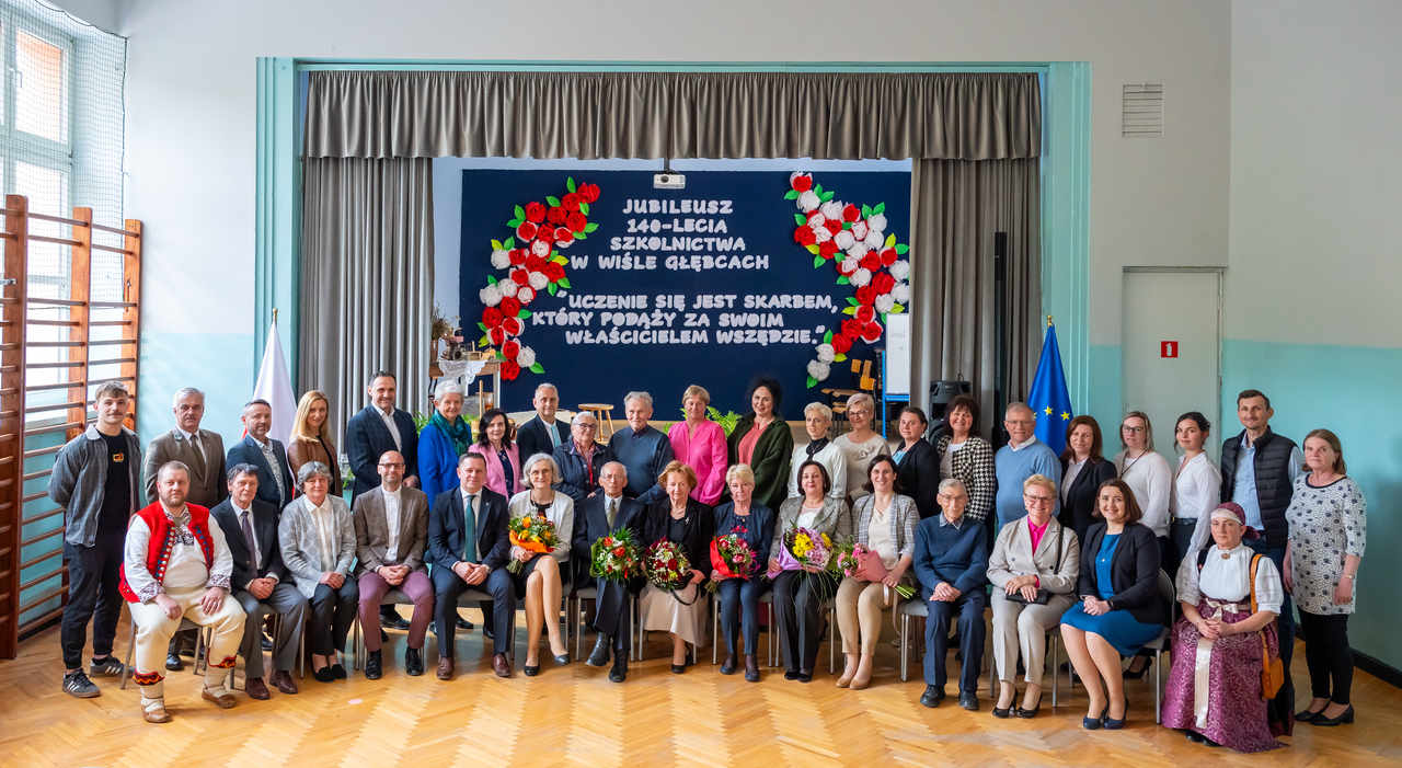 Szkolnictwo jak mało która dziedzina życia łączy w sobie całe pokolenia ludzkie, lokalne społeczności, historie regionów i dzieła, dzięki którym wnuczka może czytać wiersz swojej babci, ojciec śpiewać z córką na scenie, a osoby, które kiedyś zasiadały w ławkach szkolnych, decydować dzisiaj o obliczu szkoły, dzielnicy, a nawet całego miasta. Niezwykle uroczyście, ale również sentymentalnie przebiegły obchody z okazji 140 lat Szkolnictwa w Wiśle Głębcach, które odbyły się w Zespole Szkolno-Przedszkolnym nr 1 dnia 26 kwietnia 2024 roku. W uroczystości udział wzięli: burmistrz miasta Wisły, pan Tomasz Bujok, dyrektor ZSP 1, pani Barbara Stefańska wraz z byłymi dyrektorami naszej placówki panem Andrzejem Cienciałą, panią Krystyną Hombek – Kaftaniak oraz panią Lidią Konik, a także przedstawiciele Urzędu Miasta oraz Samorządu Miejskiego, dyrektorzy i przedstawiciele wszystkich wiślańskich szkół podstawowych oraz średnich, Nadleśnictwa, Kościołów, Społecznego Ogniska Muzycznego, Wiślańskiego Centrum Kultury, Biblioteki Miejskiej, Samorządu Rodziców, Komitetu Osiedlowego oraz Koła Gospodyń Wiejskich, emerytowani nauczyciele i pracownicy oraz absolwenci, no i oczywiście obecni nauczyciele, pracownicy oraz dzieci i młodzież. Część historyczna składała się z dwóch prezentacji multimedialnych, traktujących o czternastu dekadach nauczania w Głębcach, na Małym Stożku oraz Kubalonce, a także o czasach obecnych, sukcesach i dalszych wyzwaniach, jakie stoją przed naszą szkołą. Przy tej okazji nie sposób było również nie wspomnieć, trudnych chwil, z jakimi się w tym roku szkolnym zmagaliśmy, czyli odejściem od nas śp. Izabeli Leśniewskiej, wicedyrektor oraz nauczycielki, która pozostawiła po sobie ogromną pustkę w naszych sercach. Część artystyczna była natomiast przeglądem pokoleń. Piosenki klasy 2, wiersz babci Marii Dziuk, odczytany przez wnuczkę Julię Bednarz, scenka regionalna uczniów kilku klas, pt. „Hańdownij Dóma i w Szkole”, a także występy absolwentów, tj. pana Pawła Szarca z córką Marceliną, Pawła Cieślara, Patryka Demkowskiego czy Julii Nogowczyk, uświetniły całość tego wspaniałego dnia. Na zakończenie zebrani wspominali dawne czasy przy wypiekach rodziców naszej szkoły oraz Koła Gospodyń Wiejskich, a także wyśmienitej potrawie regionalnej, tj. „Żebroczce” przygotowanej przez panie kucharki szkoły w Głębcach. Za trud przygotowań ogromne podziękowania dla wszystkich zaangażowanych osób, które swoje pomysły i ciężką pracę wcieliły w życie, tworząc kolejny niezapomniany epizod w dziejach 140 lat szkolnictwa w Wiśle Głębcach.