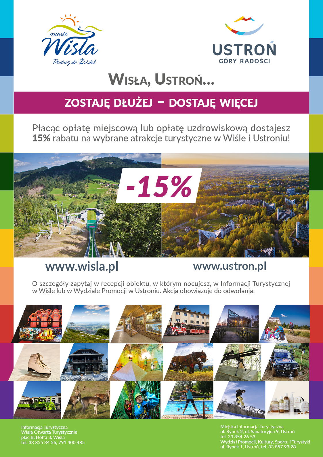 Stała współpraca Wisły z Ustroniem, a przede wszystkim z gestorami prowadzącymi działalność gospodarczą związaną z obsługą ruchu turystycznego w naszych miastach, zaowocowała kilka lat temu akcją rabatową dla turystów odwiedzających nasze miejscowości.
