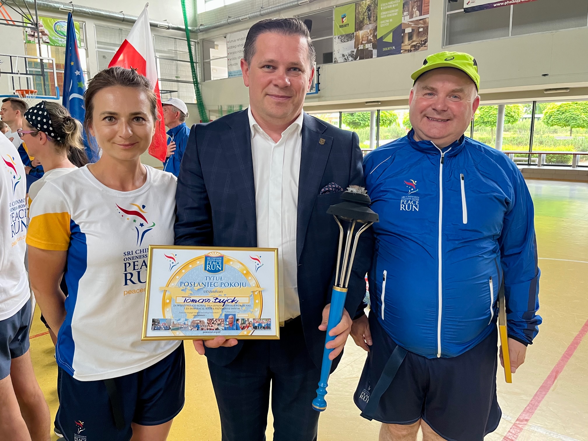 Burmistrz Tomasz Bujok oraz nauczyciel Marcin Kotowicz otrzymali pamiątkowe dyplomy z tytułem „Posłańca Pokoju”.