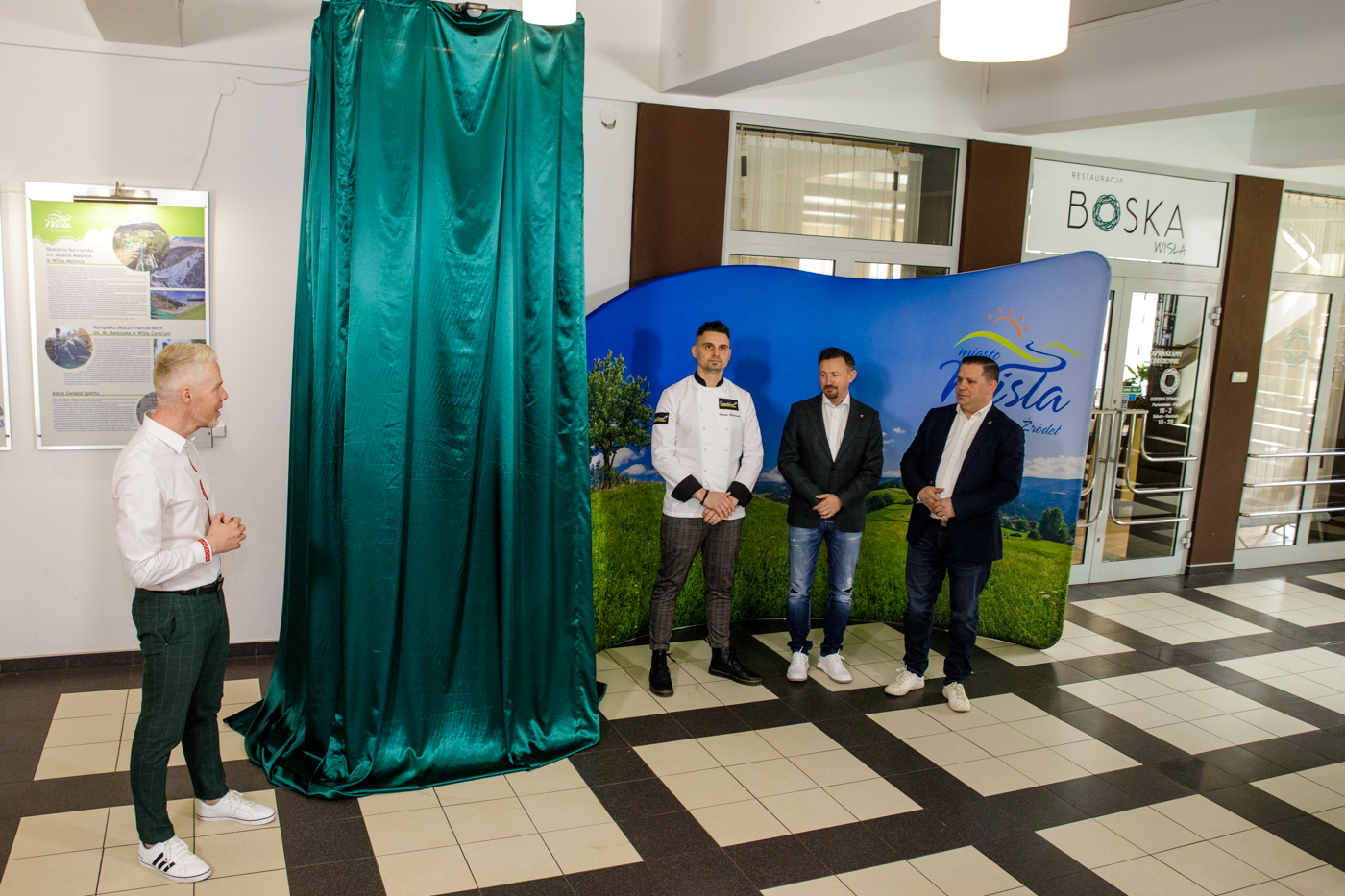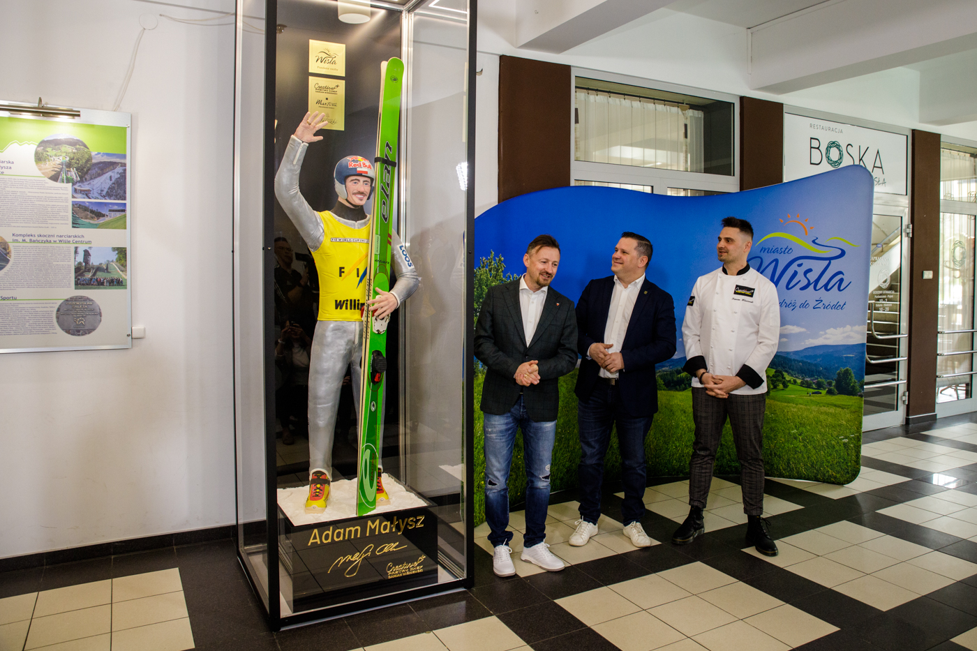 28 kwietnia, w piękne piątkowe przedpołudnie, w holu Domu Zdrojowego w samym centrum Wisły została odsłonięta nowa czekoladowa rzeźba Adama Małysza. W słowie wstępu burmistrz Tomasz Bujok przywitał wszystkich gości oraz media, a także opowiedział o tym, skąd wziął się pomysł na wymianę figury. Uroczystość zaszczycił swoją obecność szef firmy Master Martini Polska – Ruben Piekarski. Firma ta podarowała materiał, czyli czekoladę, z której powstała rzeźba. W gronie gości znaleźli się także: sekretarz Miasta Wisła Sylwester Foltyn, Przewodniczący Komisji Promocji, Turystyki, Kultury i Sportu Rady Miasta Wisła Sławomir Wantulok, prezes Śląsko-Beskidzkiego Związku Narciarskiego Andrzej Wąsowicz, prezes Wiślańskiego Stowarzyszenia Sportowego Zbigniew Wuwer oraz właścicielka cukierni „U Janeczki” Karolina Szeja wraz z mężem.
