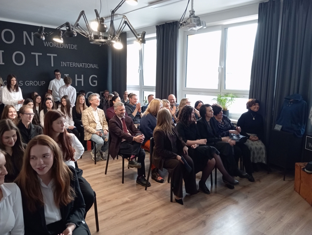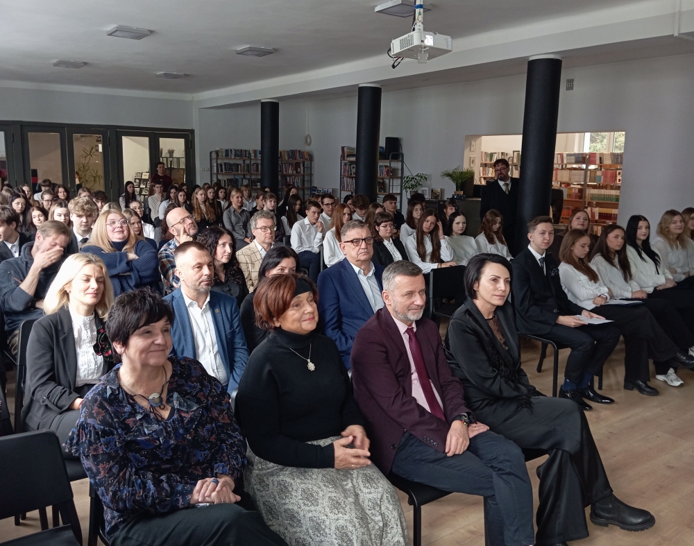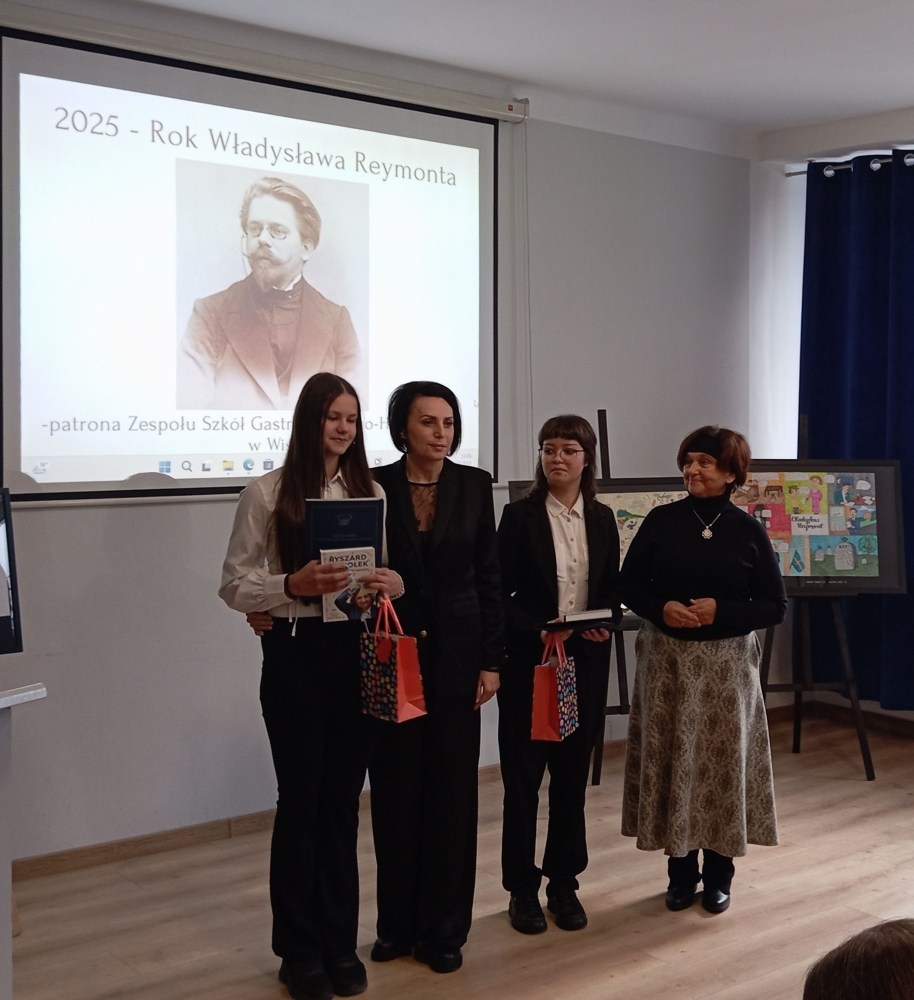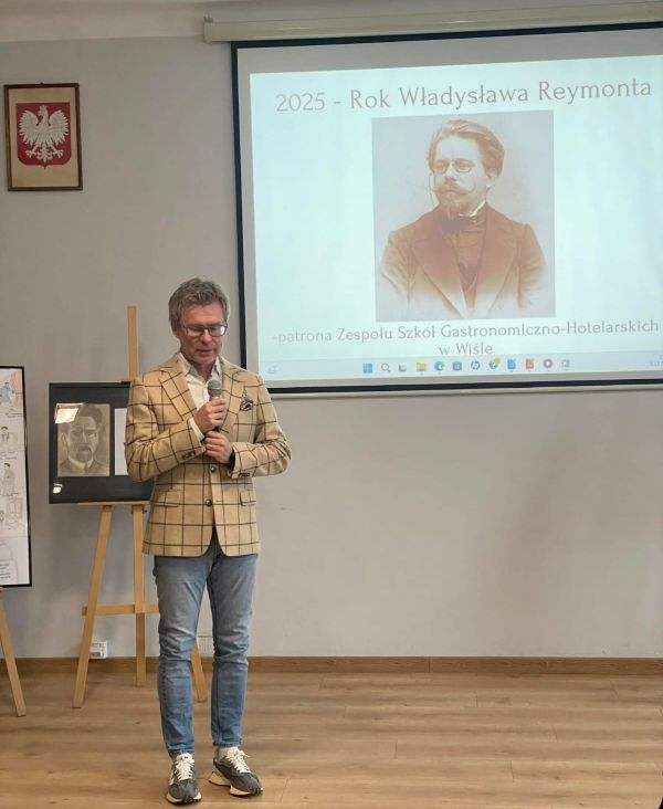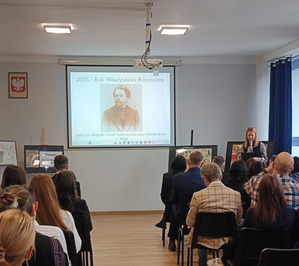 w jubileusz 90-lecia Zespołu Szkół Gastronomiczno-Hotelarskich im. Władysława Reymonta w Wiśle – o czym mówiła pani dyrektor Kornelii Zubek, witając szacownych gości: panią Janinę Żagan - Starostę Powiatu Cieszyńskiego, pan Michała Rajwę – Naczelnika Wydziału Edukacji, panią Danutę Łabaj – Przewodniczącą Komisji Edukacji, panią Anetę Legierską-Bujok – Przewodniczącą Komisji Kultury, Sportu i Promocji, panią Katarzynę Czyż-Kaźmierczak - Zastępczynię Burmistrza Miasta Wisła, pana Zdzisława Pilcha – Radnego Miasta Wisła, pana Zbigniewa Wuwera – Prezesa Wiślańskiego Stowarzyszenia Sportowego, pana dr. Sebastiana Chachołka – Dyrektora Muzeum Magicznego Realizmu w Wiśle, panią Annę Łupieżowiec – Dyrektor Wiślańskiego Centrum Kultury wraz z panią Kamillą Księżnik, panem Andrzejem Drobikiem oraz panem Szymonem Pilchem (zaangażowanymi w realizację podcastu „Zupełna cisza - Reymont w Wiśle").
